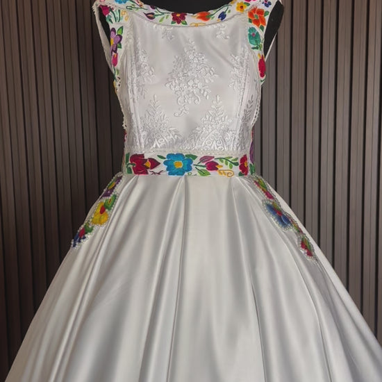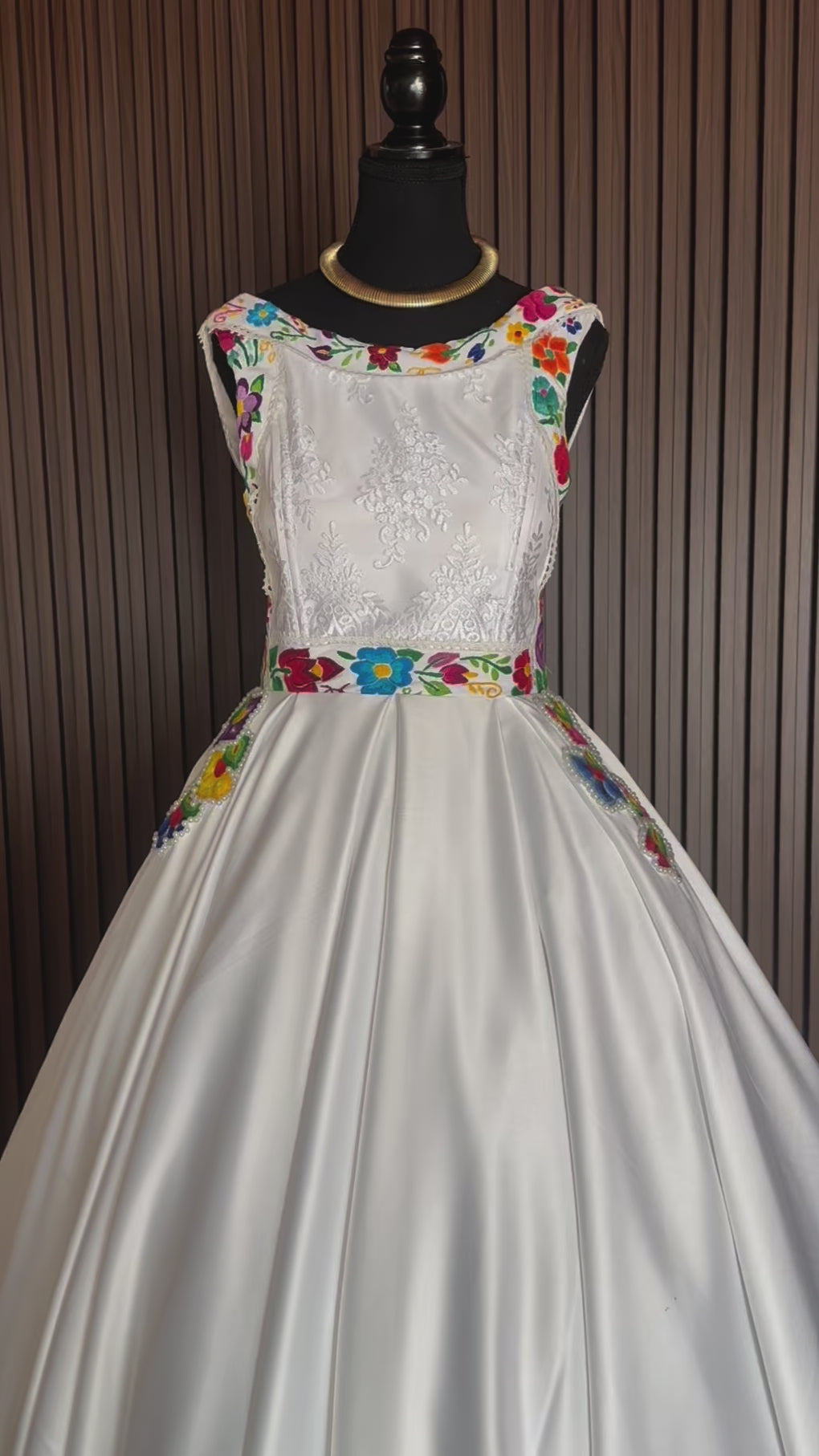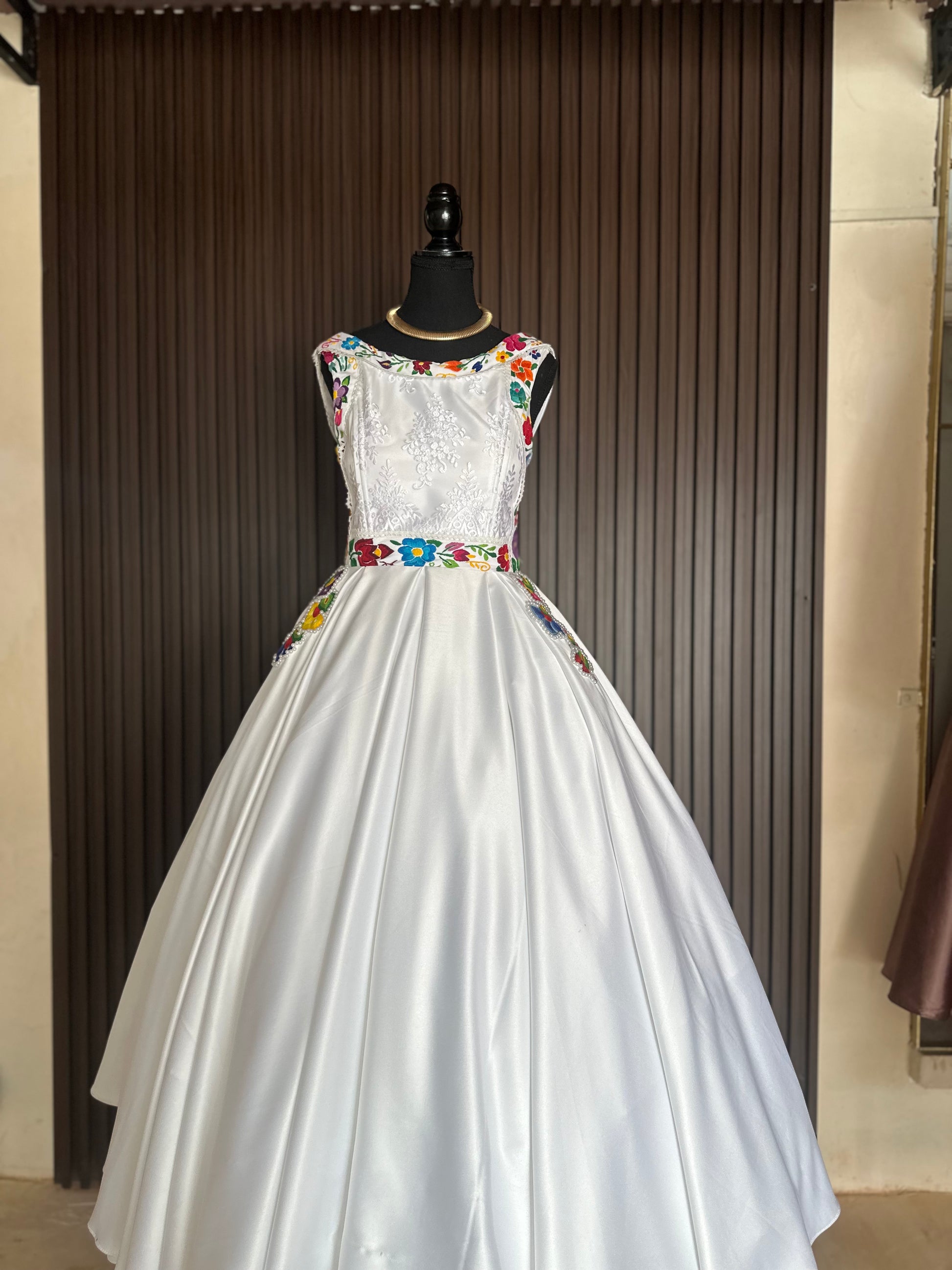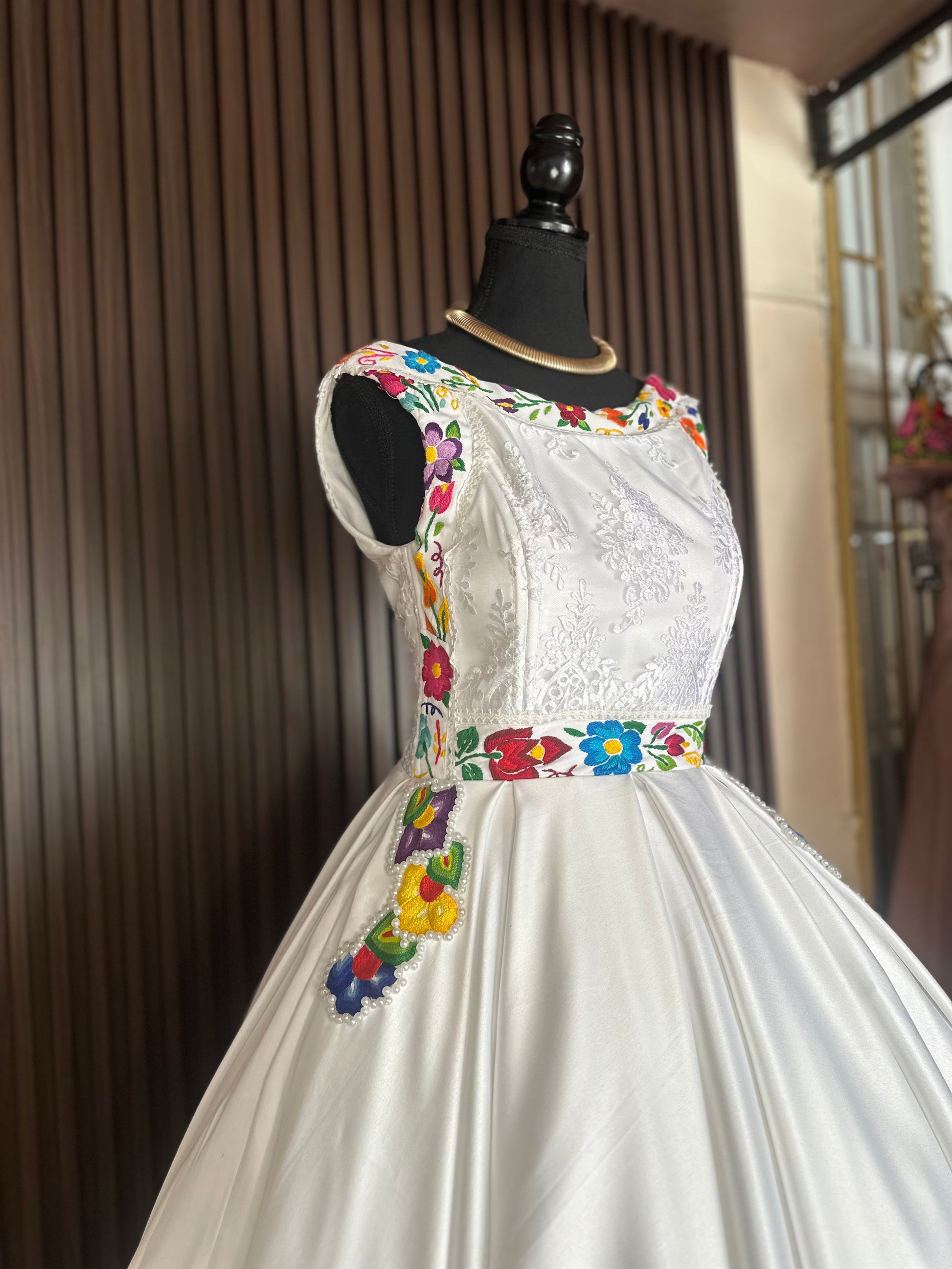 Vestido de novia Amara, el talle es bordado a mano con técnica de ganchillo por mujeres artesanas del Istmo de Tehuantepec, Oaxaca, la falda es circular de satin color ivory, con cierre en la espalda