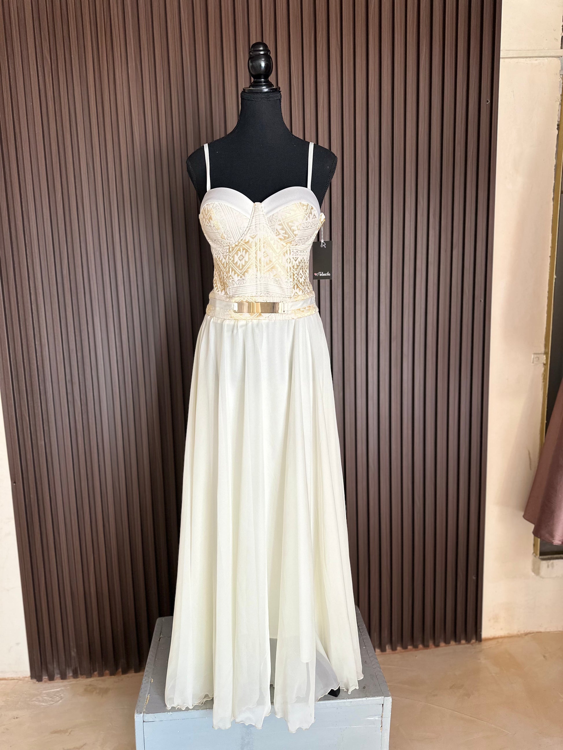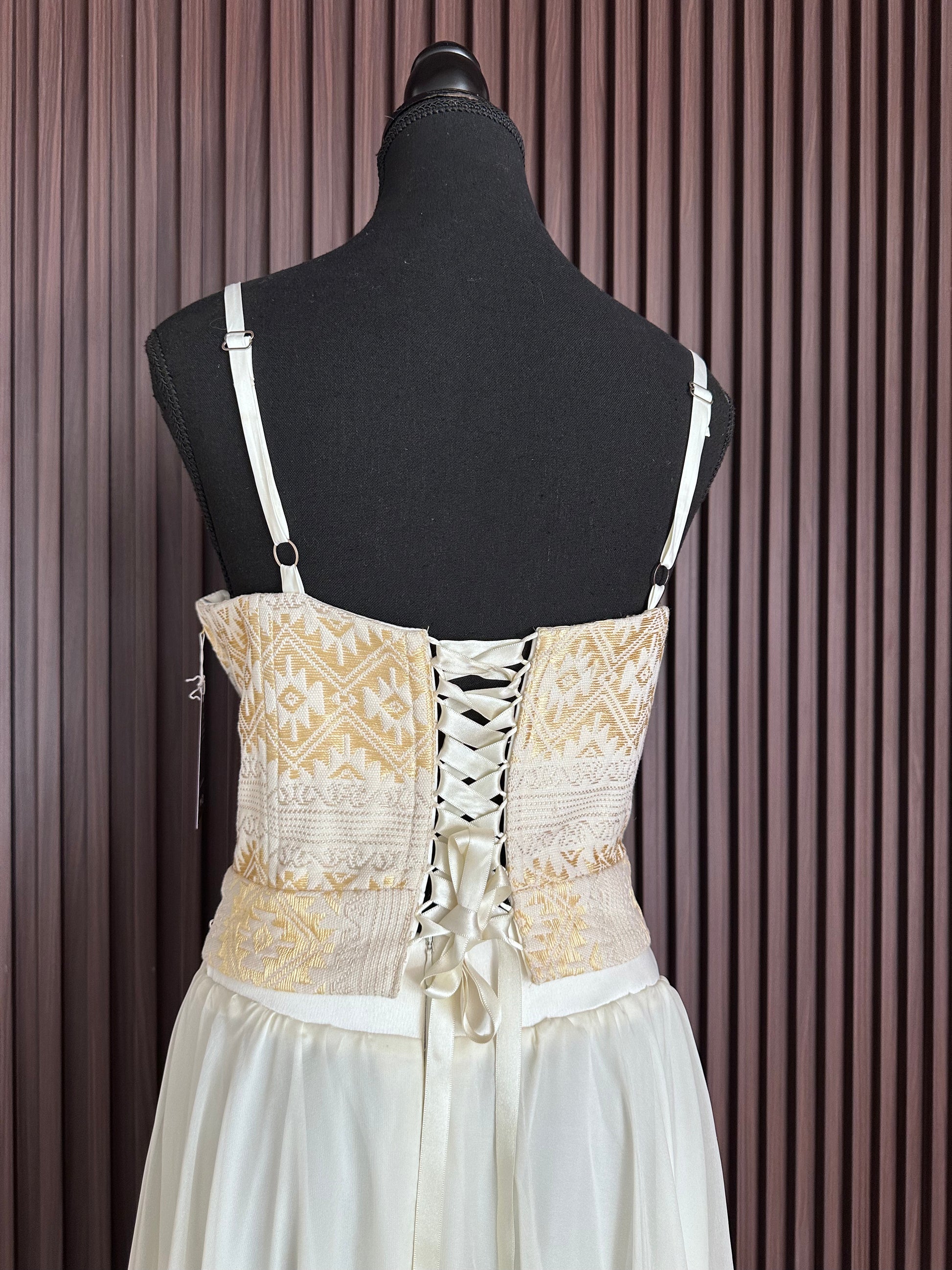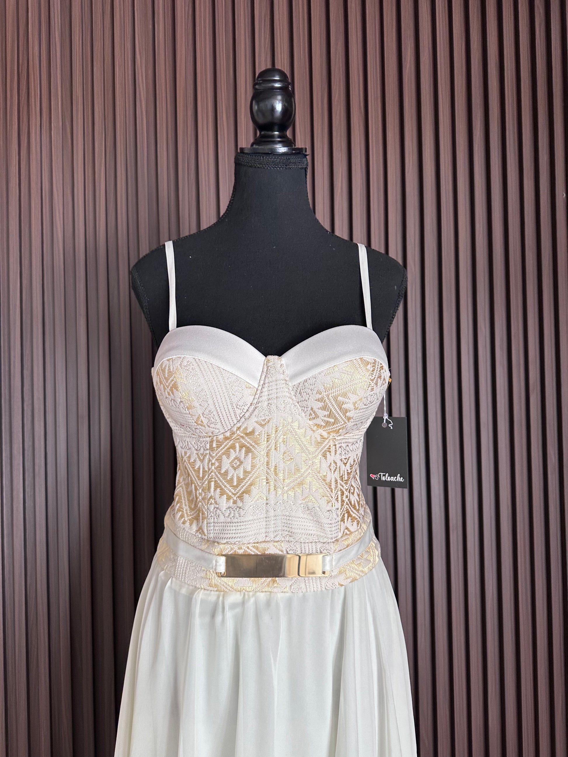 Conjunto de bustier elaborado de telar de cintura en tonos crema y dorados, con una placa en la cintura, con copas push-up, varillas y presillas para ajustar al gusto, al falda es de gasa con una caída perfecta y cierre en la parte de atrás.