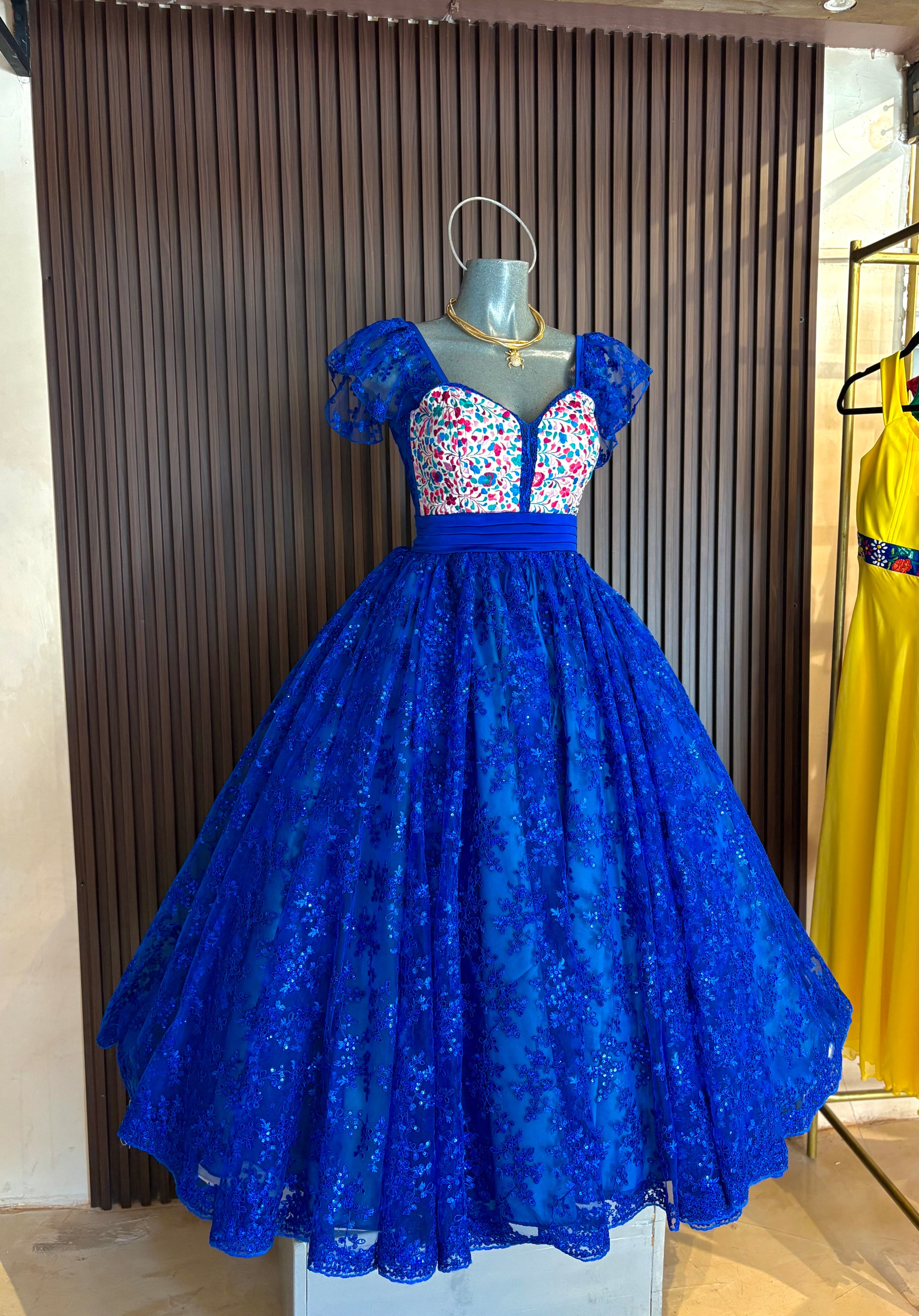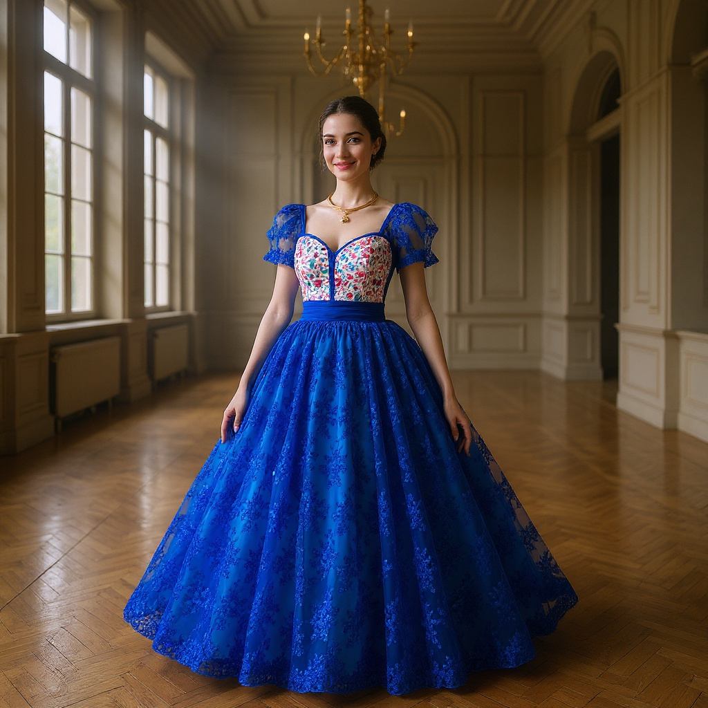 Vestido de gala en tono azul que remite a la realeza, elaborado con falda amplia de tul bordado que aporta textura y brillo. El corset resalta con delicados bordados artesanales de San Antonino Castillo Velasco, reconocidos por su finura y tradición. Sus mangas cortas en tul transparente añaden un toque romántico y ligero, mientras que la silueta resalta la cintura, creando una pieza elegante y sofisticada.