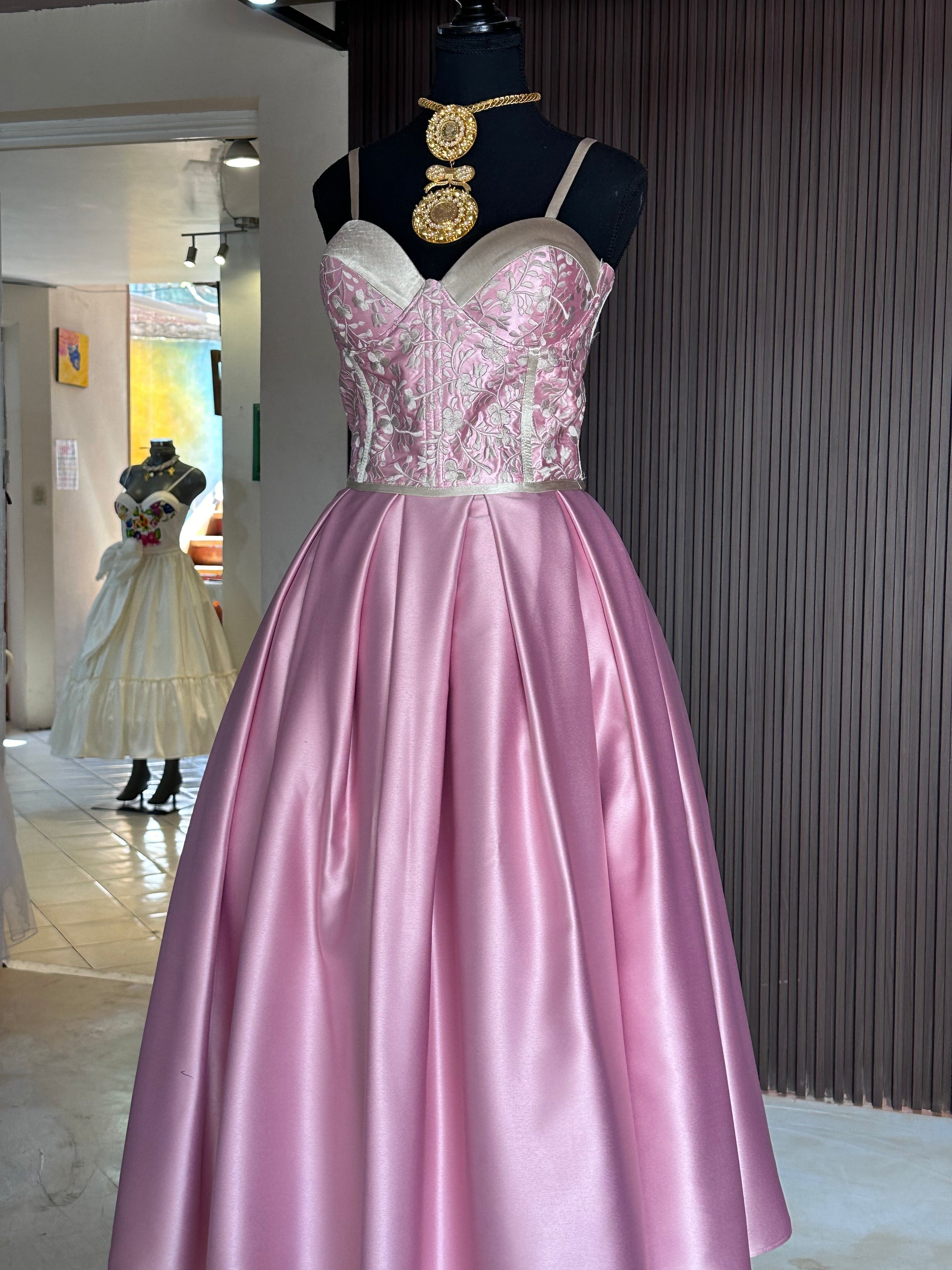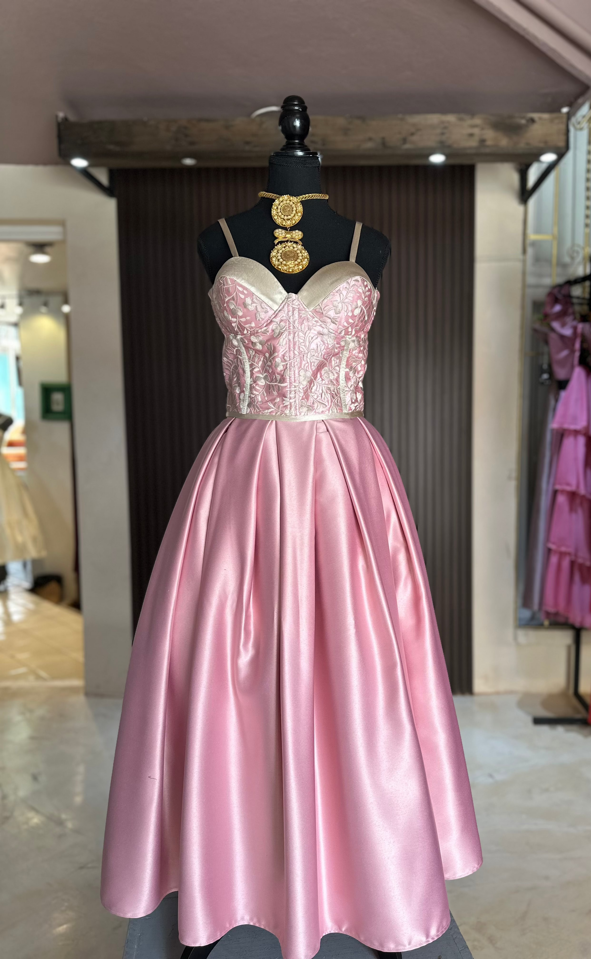 La falda es satinada en color rosa bebé, en un corte circular tableado y cierre en la parte de atrás