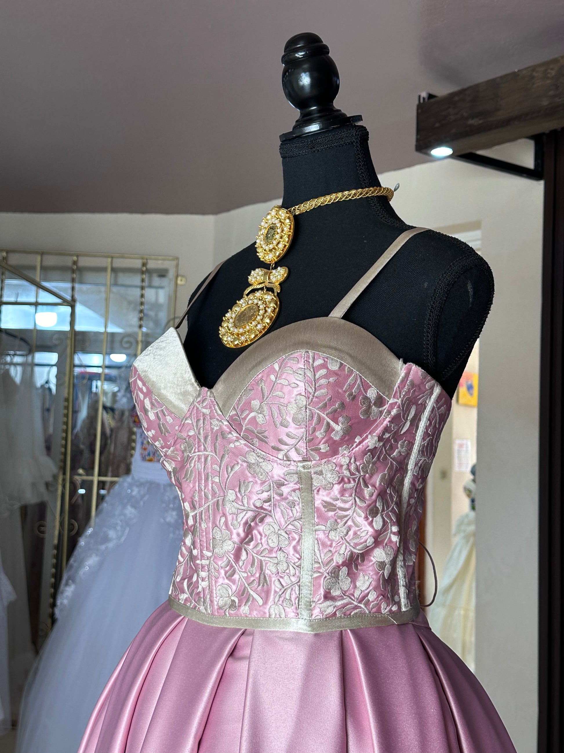 Conjunto bustier y falda, el bustier esta bordado a pedal en tonos dorados claros, con copas push-up, varillas y presillas para ajustar al gusto