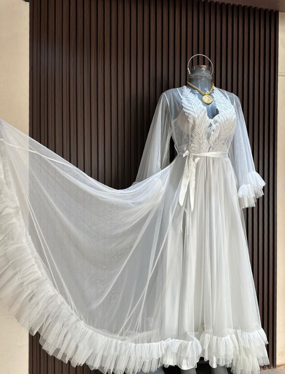 Envuelve tu feminidad en esta exquisita bata de novia estilo vintage, confeccionada en delicado tul blanco con un diseño vaporoso y elegante. Su silueta fluida está adornada con volantes en puños y ruedo, aportando un toque romántico y atemporal. El escote profundo, enmarcado por apliques bordados en forma de hojas, evoca la sofisticación del ajuar nupcial tradicional con un aire etéreo.