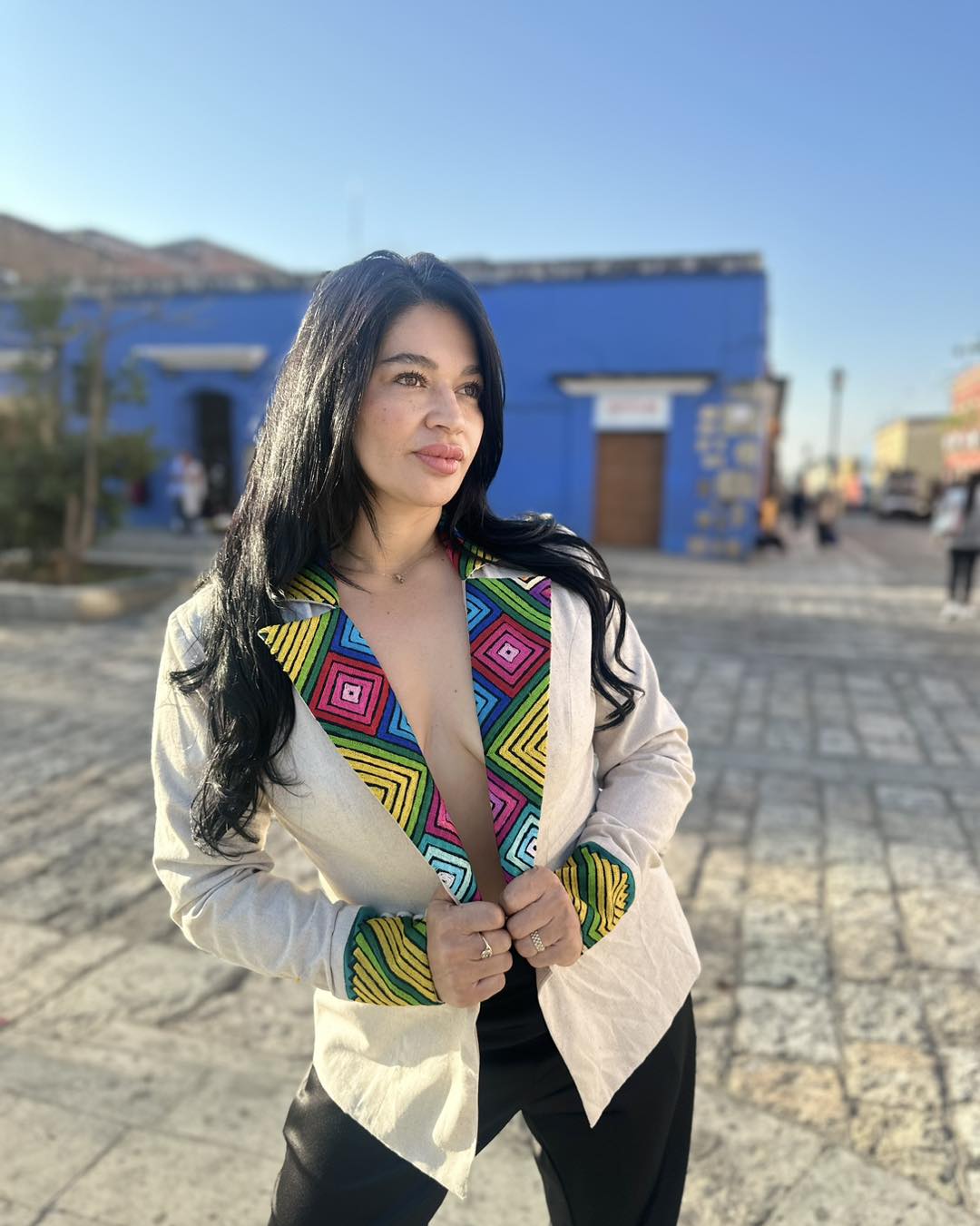 Blazer elaborado de lino color arena, con bordado de cadenilla elaborado en el Istmo de Tehuantepec, Oaxaca