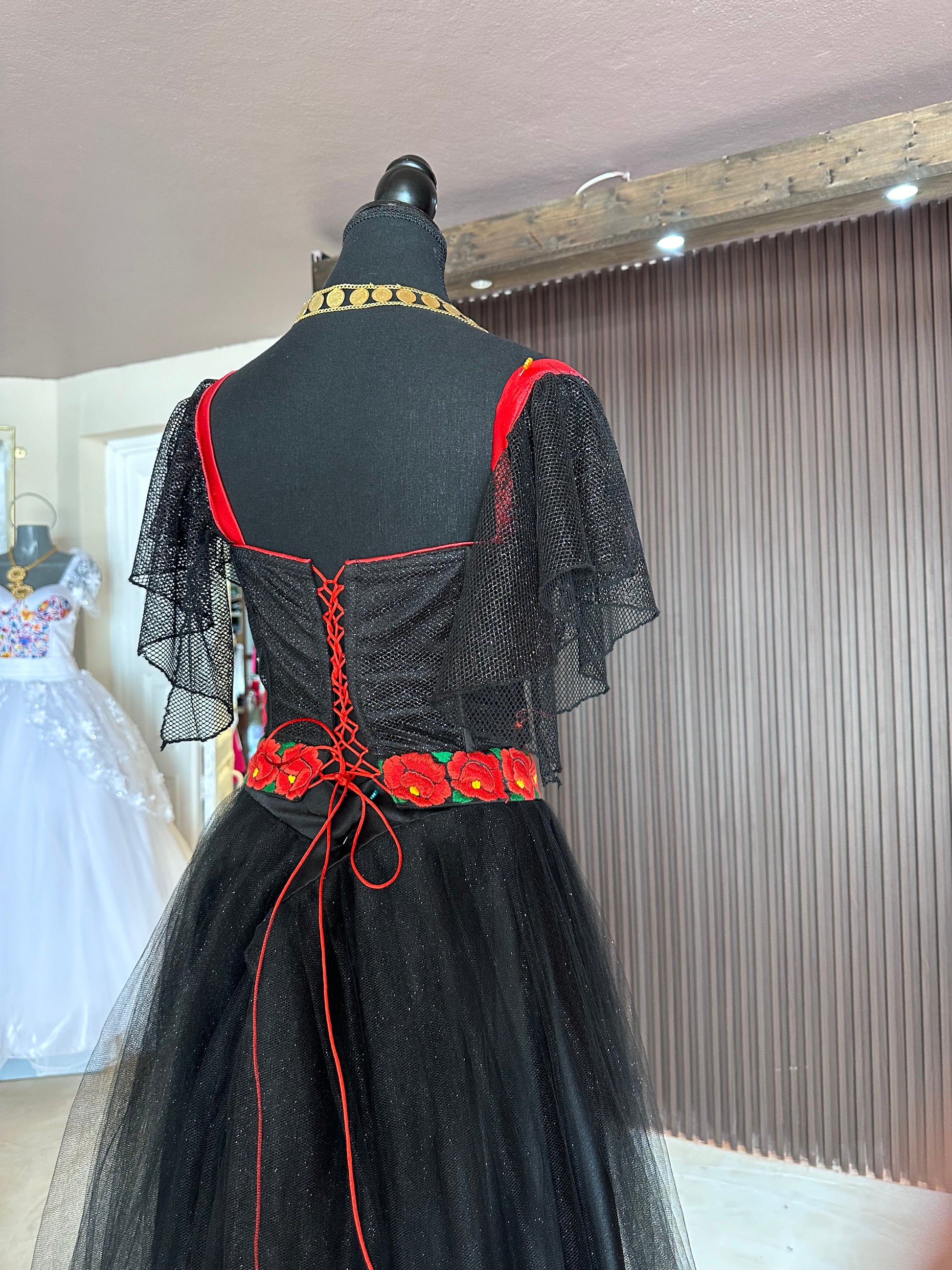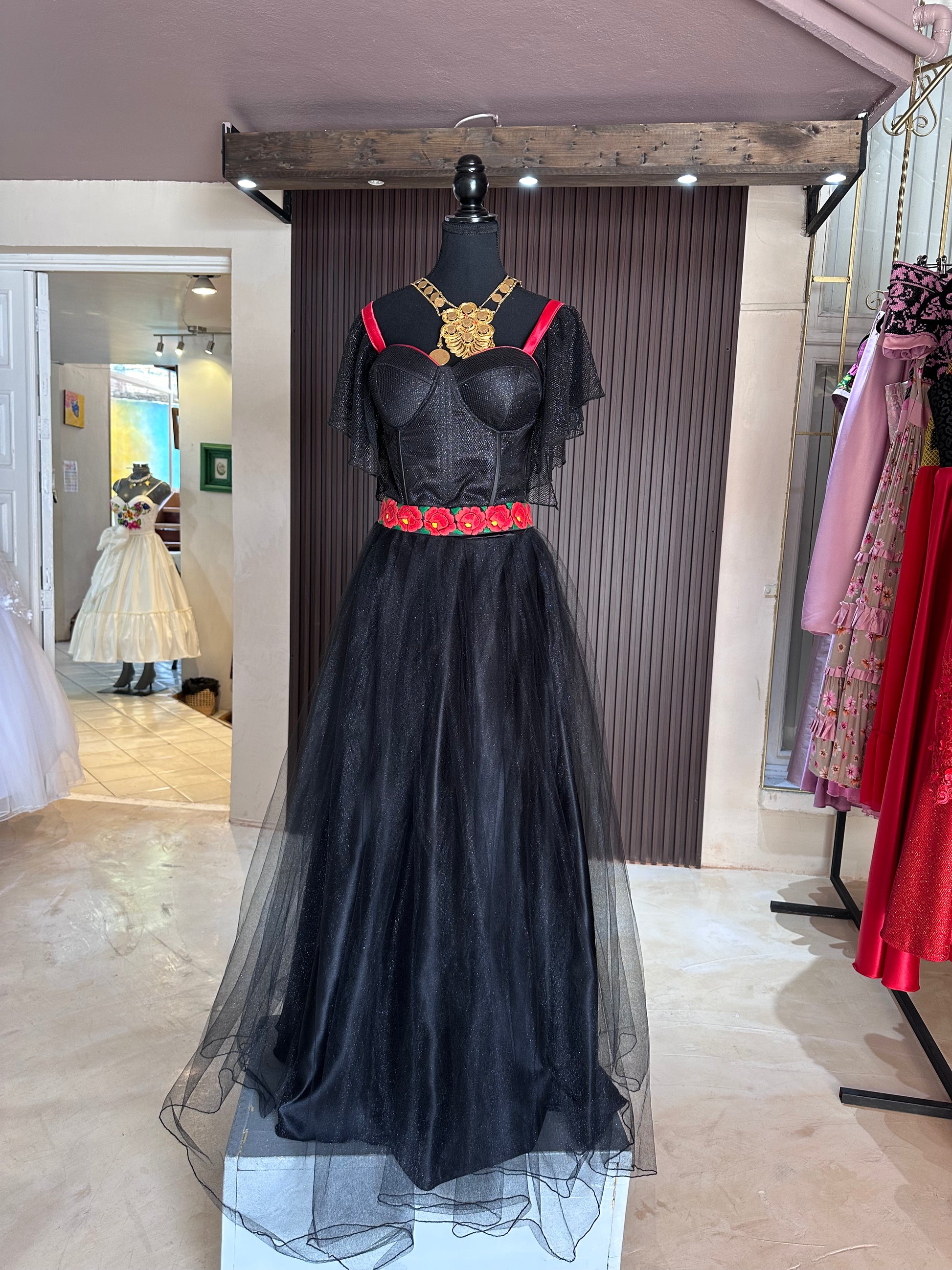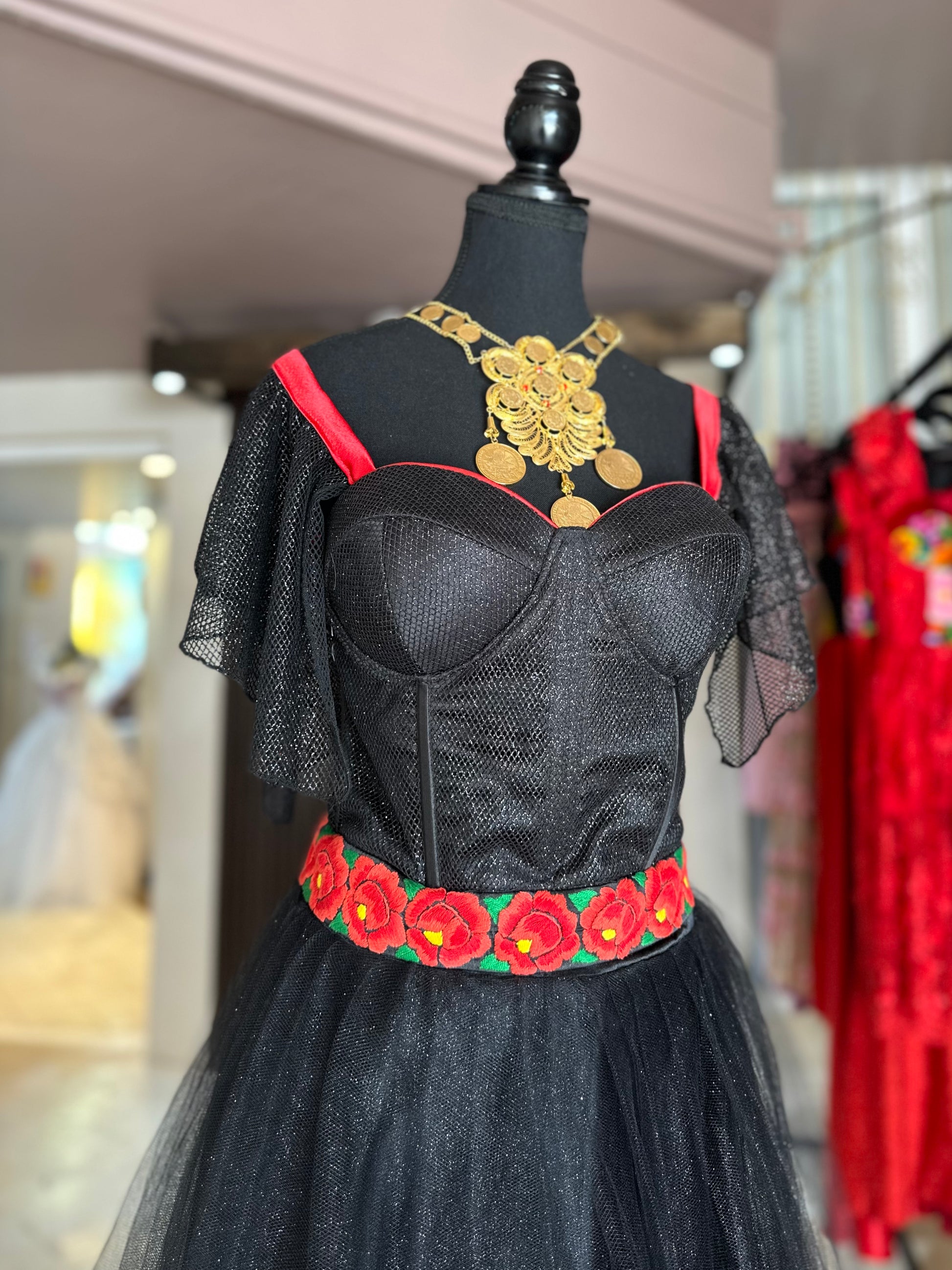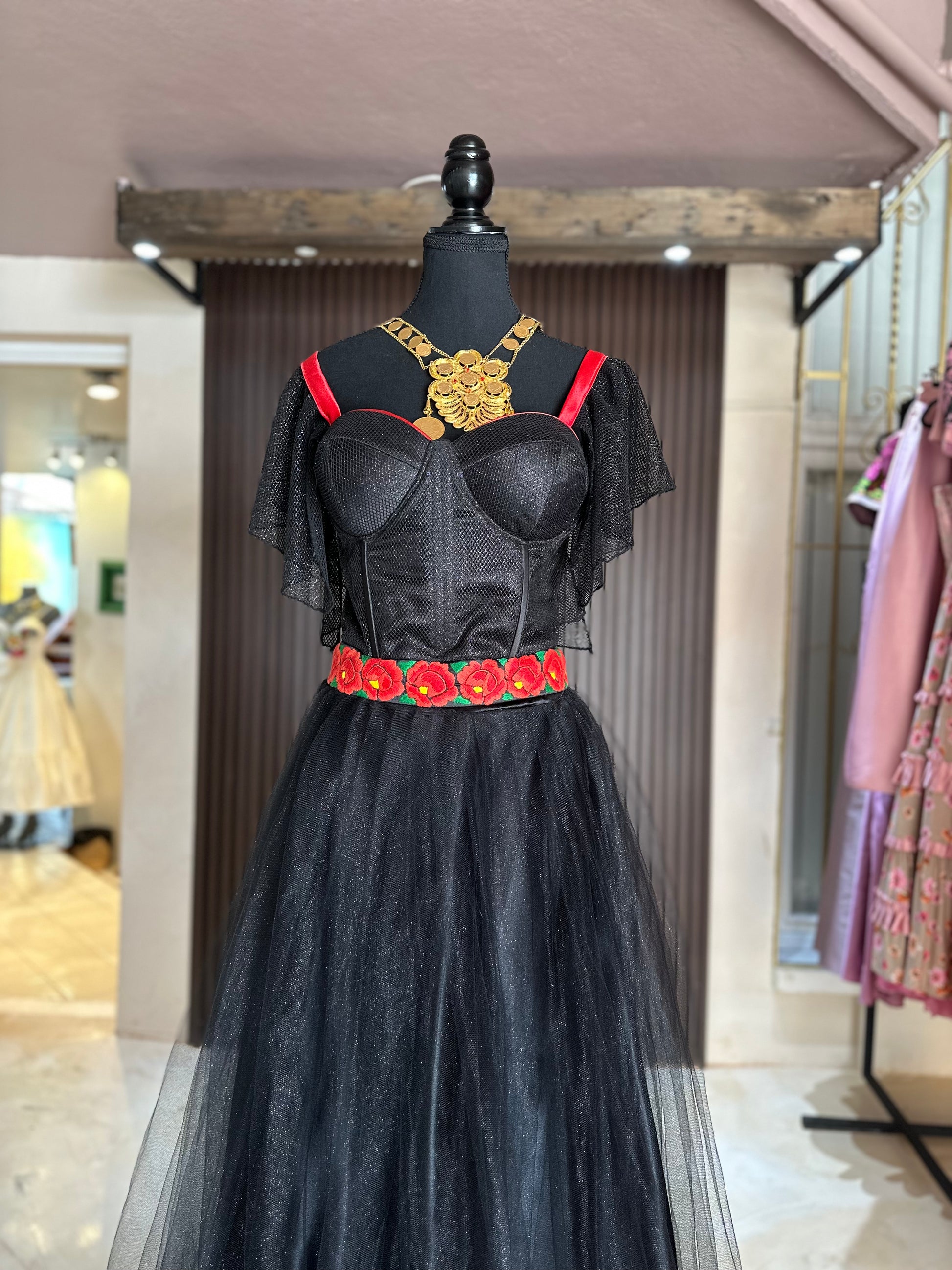 Conjunto bustier y falda de tul color negro, ambos con glitter, el talle es un corte de bustier con copas push-up, varillas y presillas para ajustar al gusto, acompañado de un bello bordado a mano con técnica de aguja por mujeres artesanas del Istmo de Tehuantepec, Oaxaca.