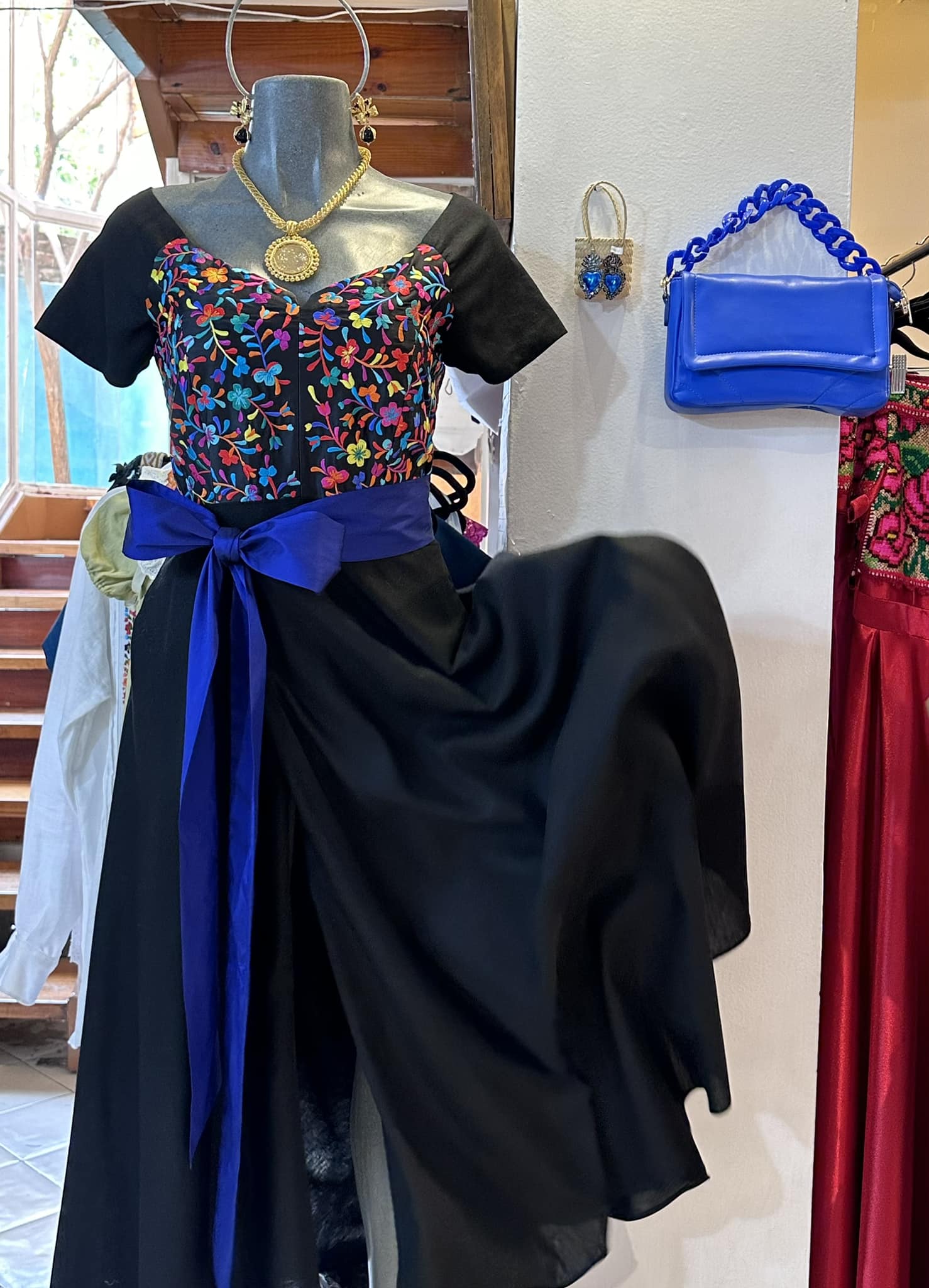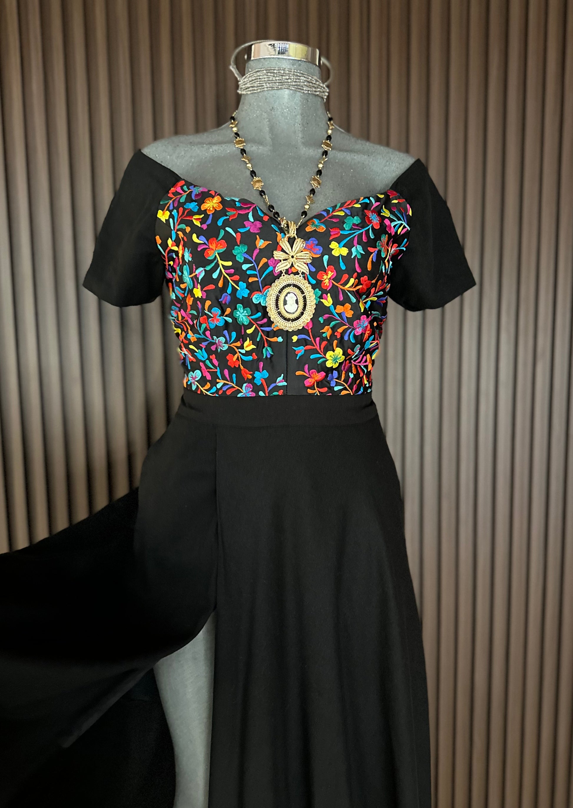 Vestido de lino algodón elaborado en un corte circular con una abertura cruzada, en el talle un bordado de San Antonino, Oaxaca, con cierre en la espalda.