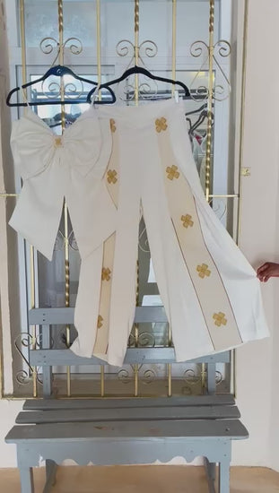 Conjunto de top y pantalón, elaborados de tela satinada y telar de cintura, el pantalón es tiro alto con cierre.