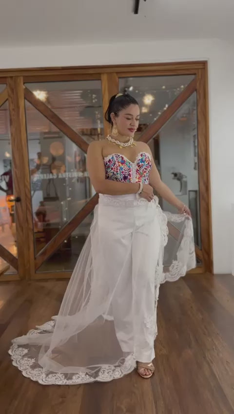 Pantalon de satin en un corte recto, pretina de 5cm y cierre en la parte del costado, incluye el velo.