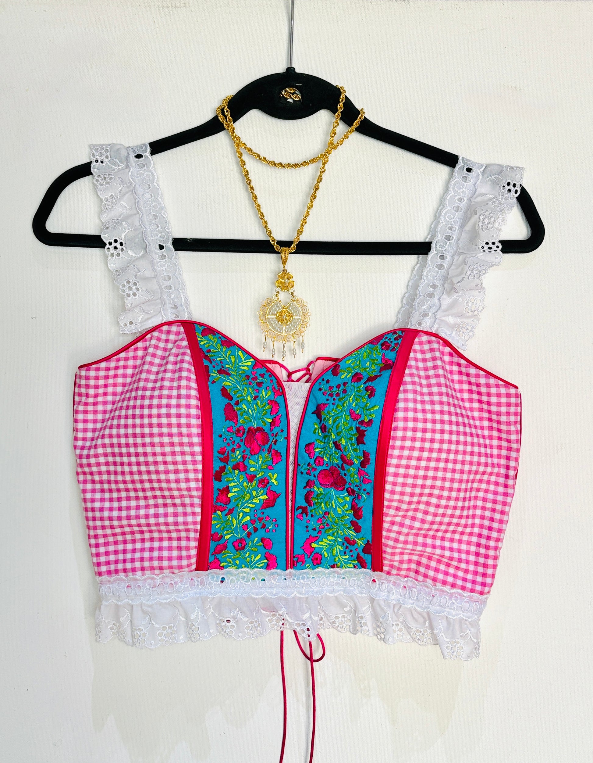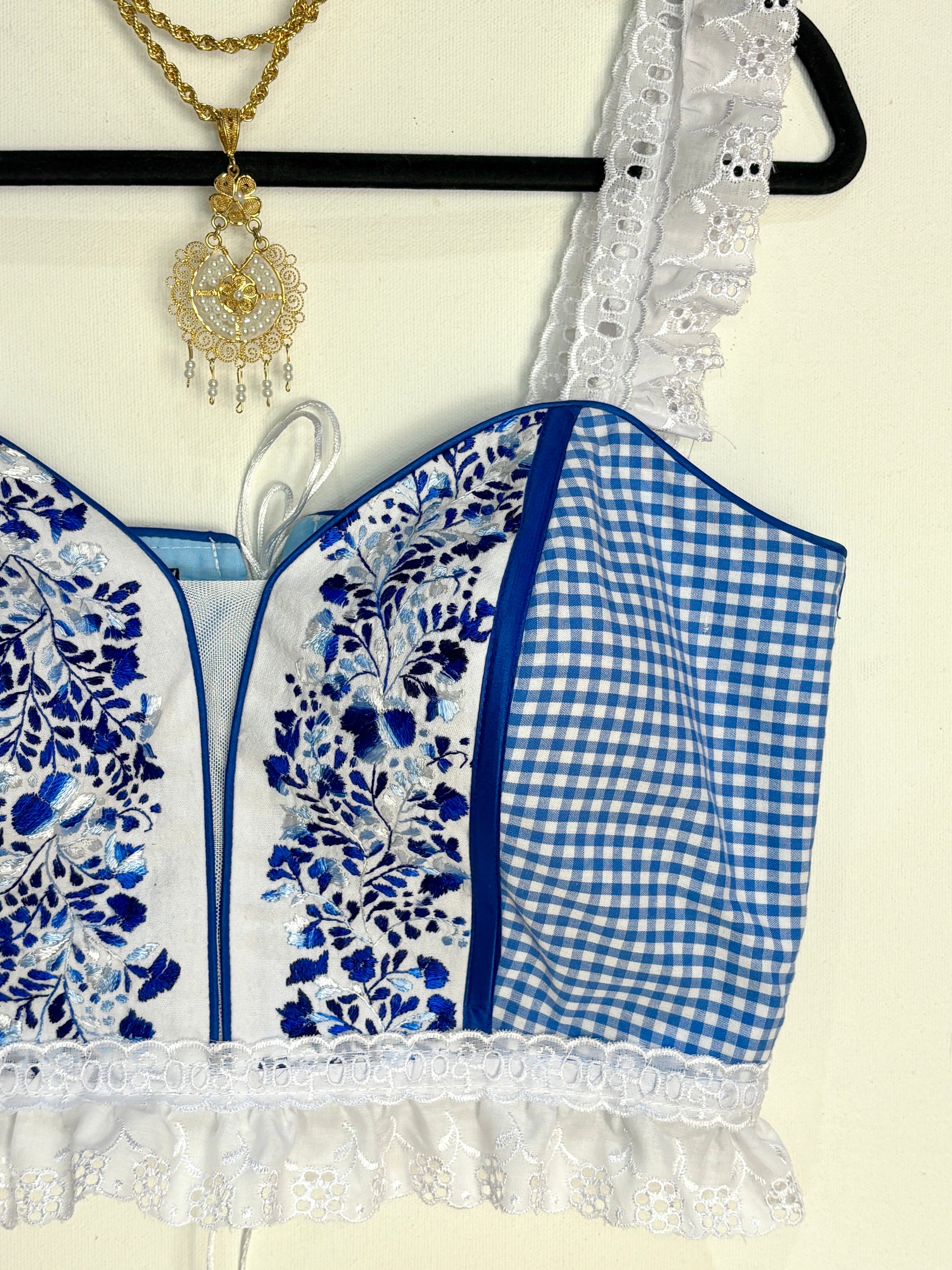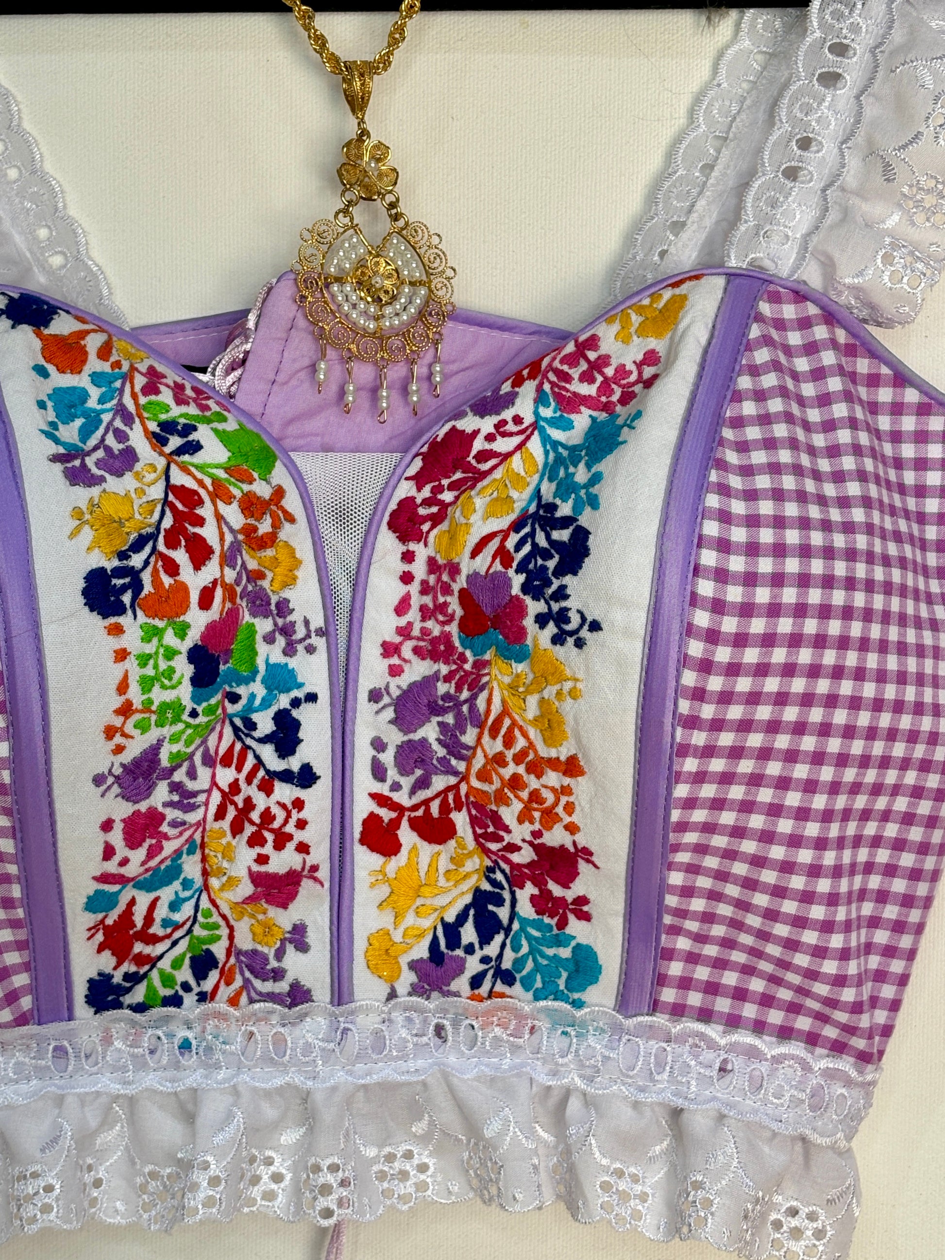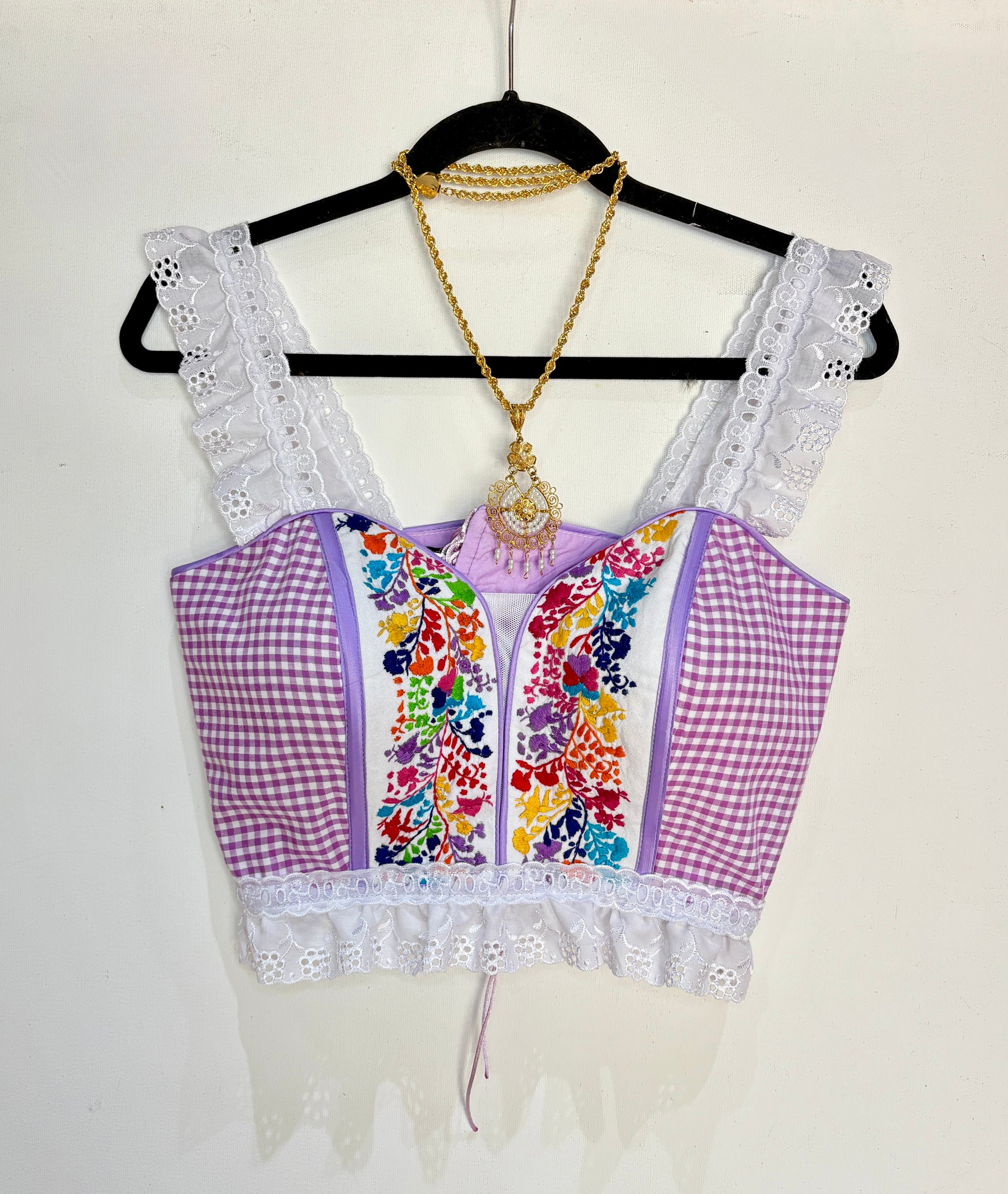 Corsé de algodón, elaborado con un bello bordado de San Antonino a mano con hilos de seda, y algodón bordado para un olancito en la parter baja y tirantes.