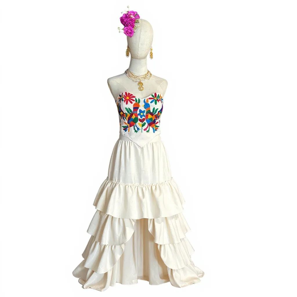 Conjunto bustier y falda de olanes caídos, bordado originario de Hidalgo.