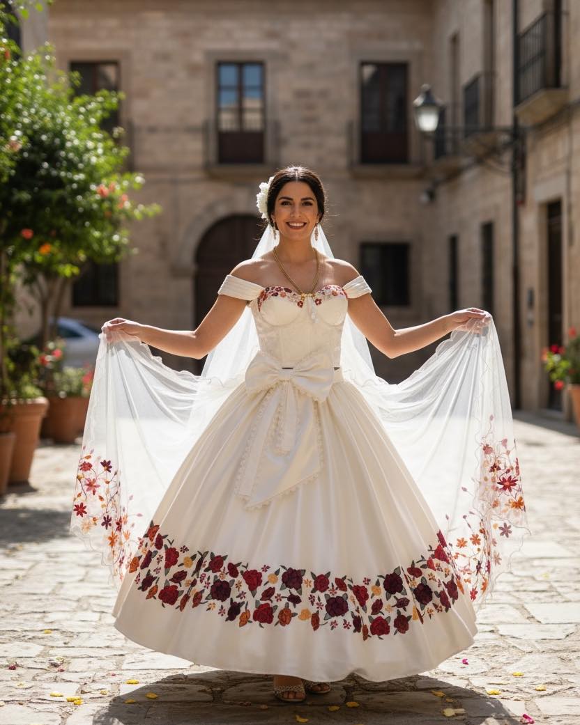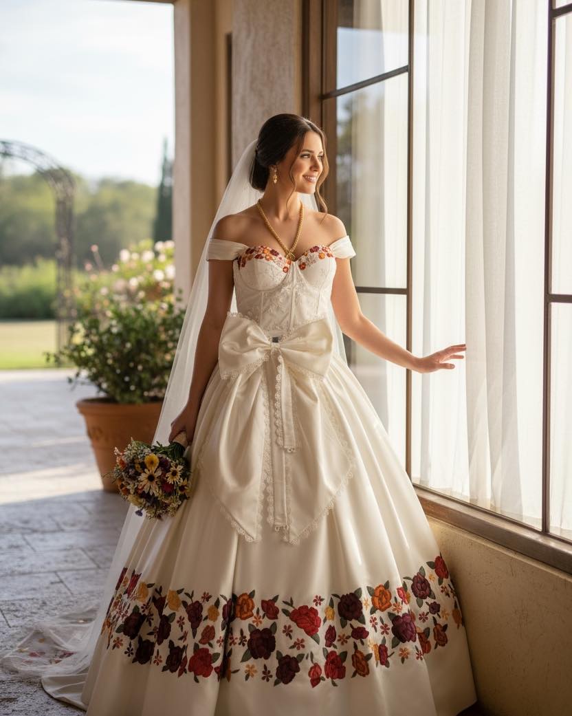 Este vestido de novia en color ivory combina la elegancia con la delicadeza del bordado en colores otoñales, evocando la calidez de esa estación. Su falda doble circular con crinolina ofrece un volumen sutil y sofisticado que realza la silueta, mientras que el talle bustier aporta un toque clásico y femenino.