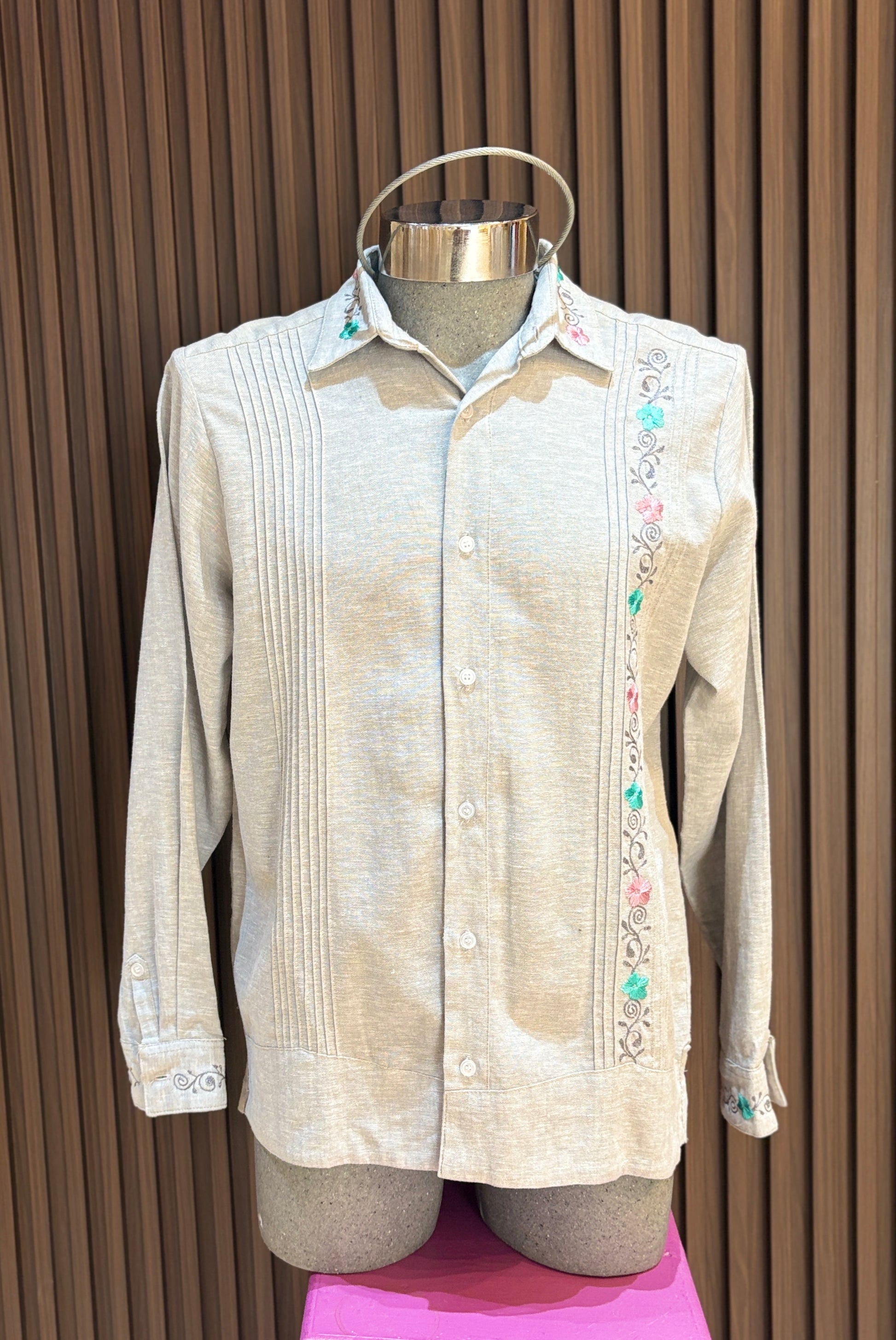 Lino puro color gris claro, con una tira, cuello y puño bordado Santo Domingo Albarradas, Oaxaca.