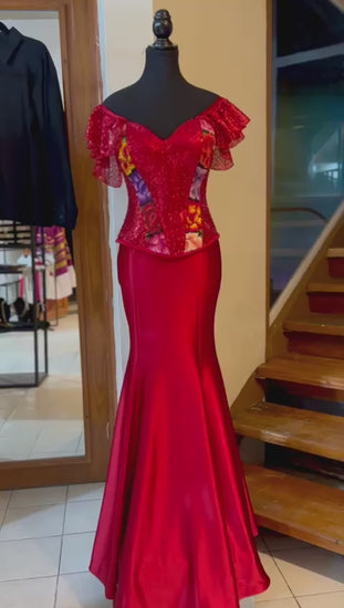 Conjunto rojo con un bello bordado del istmo, el corsé esta hecho con suma delicadeza para amoldarse perfectamente a tu cuerpo, tiene copas push-up, varillas y presillas para ajustar al gusto, la falda esta hecha en una tela satinada y un cierre en la parte de atrás.