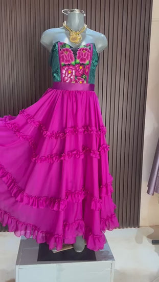 Maxi vestido de gasa color bugambilia con talle de corsetería en color verde botella bordado a mano con técnica de ganchillo en color bugambilia