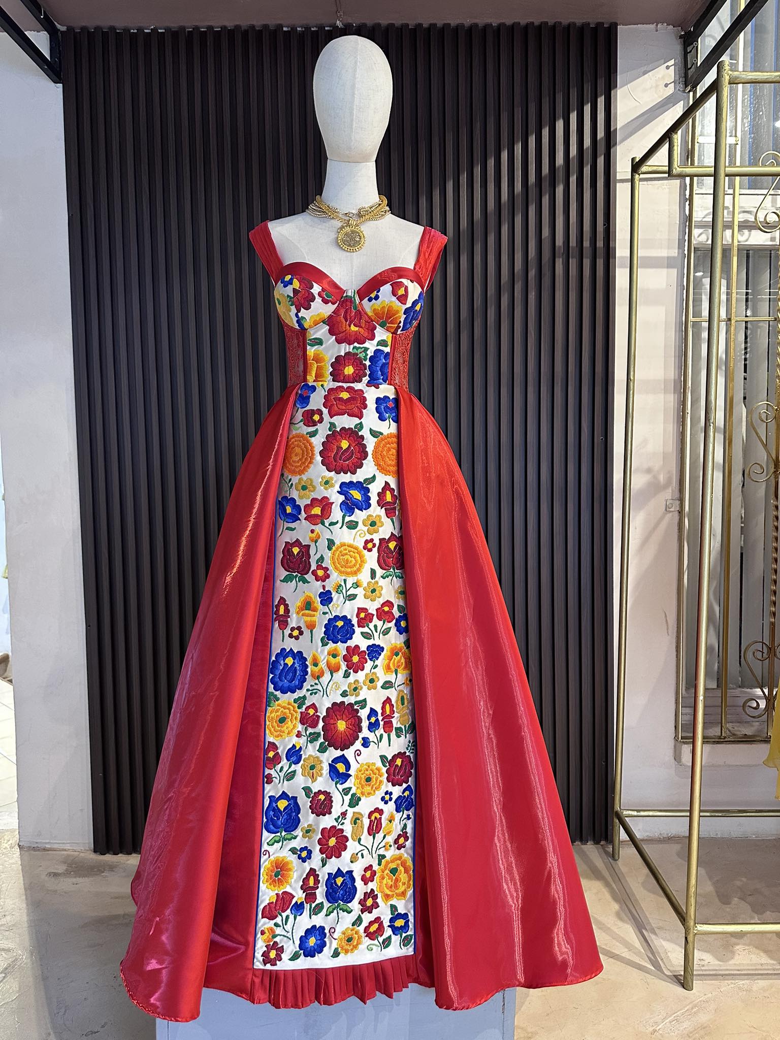 Este vestido de gala en un vibrante rojo intenso destaca por su bordado artesanal realizado a mano con técnica de aguja por talentosas mujeres del Istmo de Tehuantepec, Oaxaca. Su talle bustier con varillas, copas y presillas garantiza un ajuste perfecto y elegante, realzando la figura con sofisticación y comodidad. Ideal para ocasiones especiales donde el detalle y la tradición se combinan con un diseño impecable.