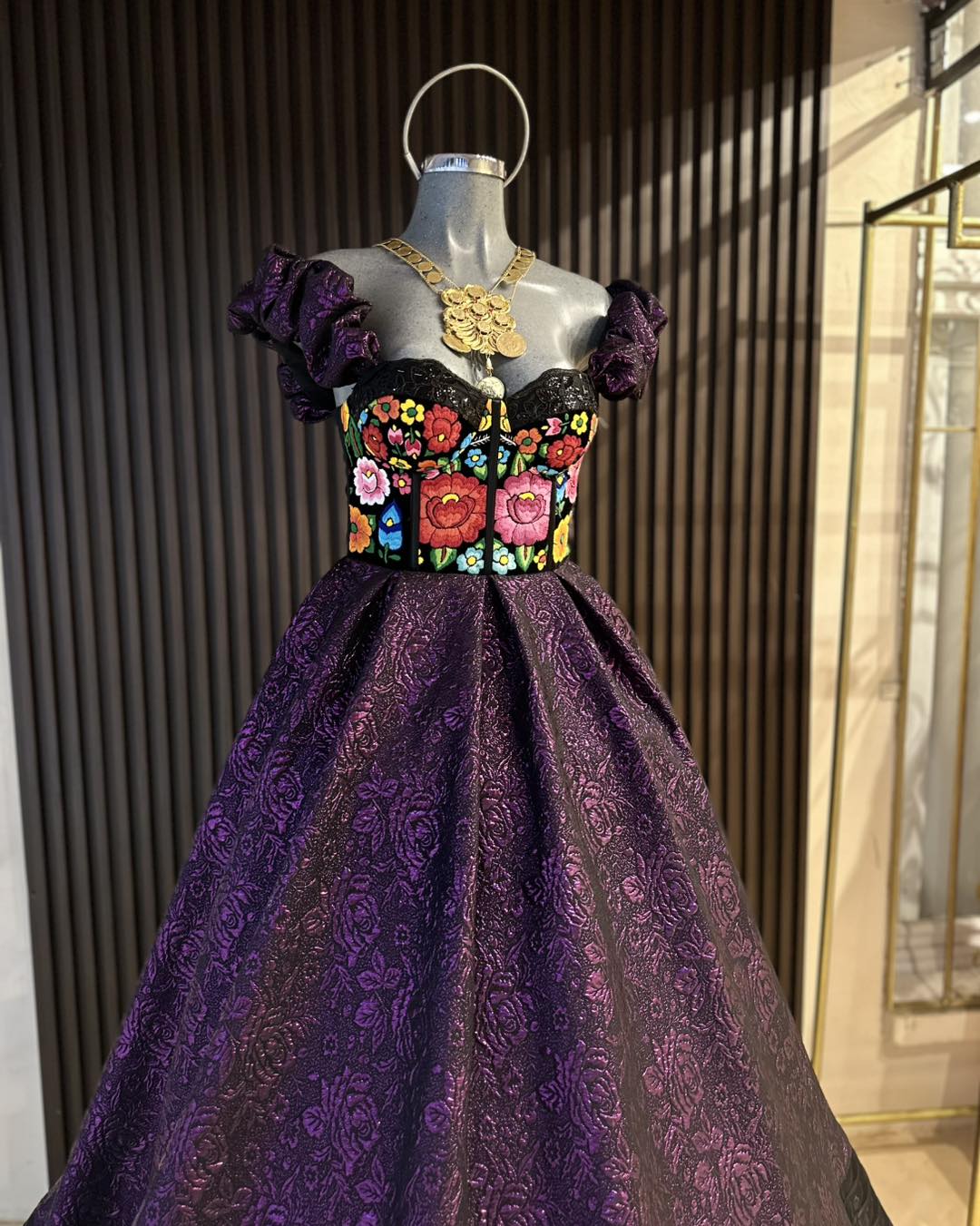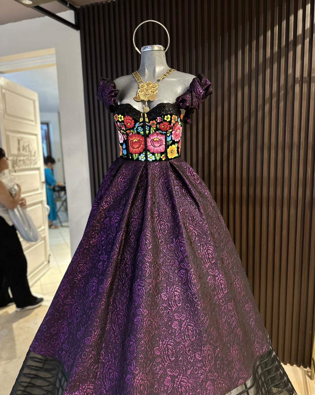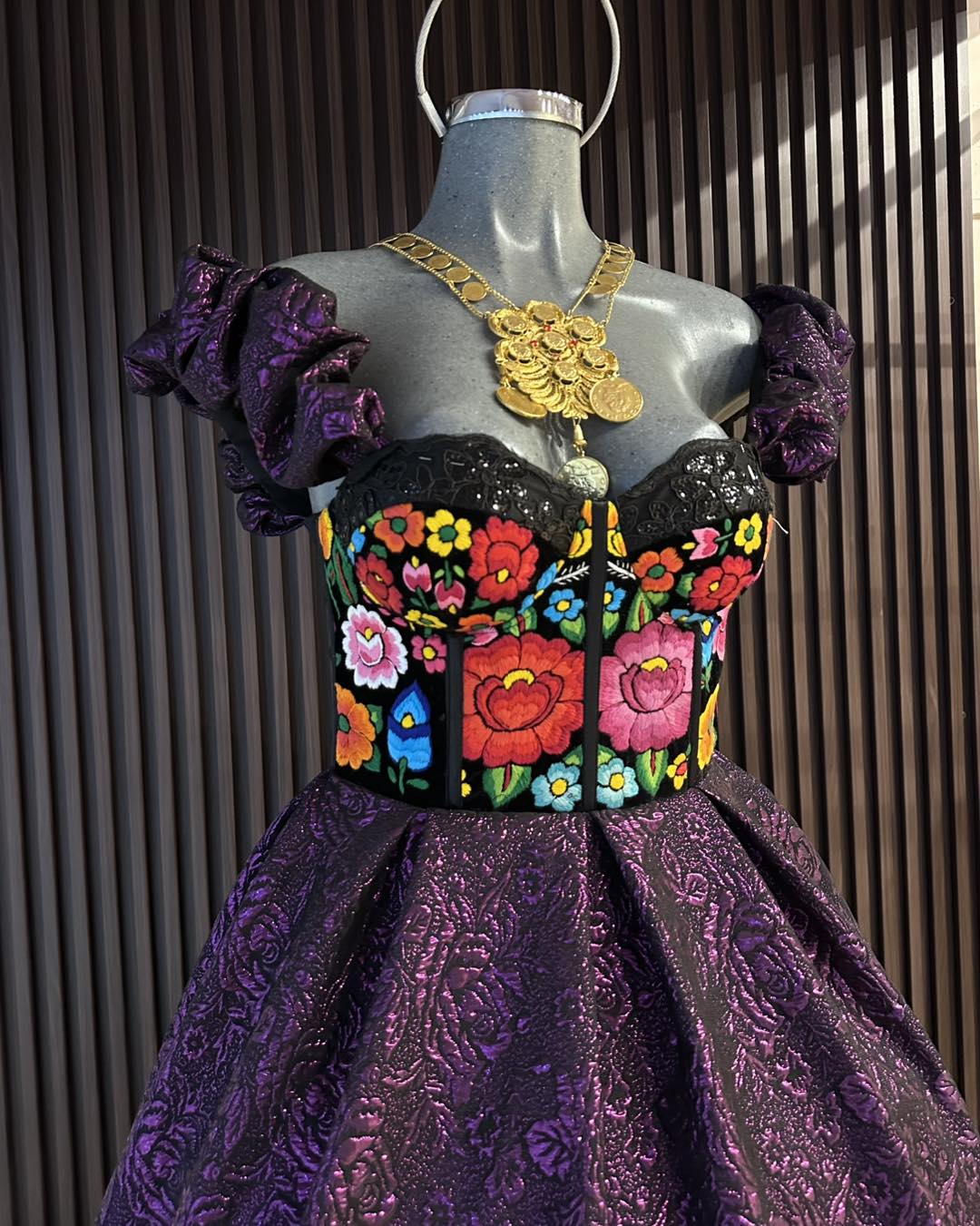 Este vestido de gala combina elegancia y artesanía en cada detalle. Confeccionado en tela brocada de doble corte circular, incluye una crinolina desmontable para que elijas cómo lucirlo. La parte superior tipo bustier está bordada a mano por mujeres artesanas del Istmo de Tehuantepec, usando técnica de aguja tradicional. Cuenta con copas, varillas y presillas para un ajuste personalizado que realza la silueta con sofisticación y comodidad.