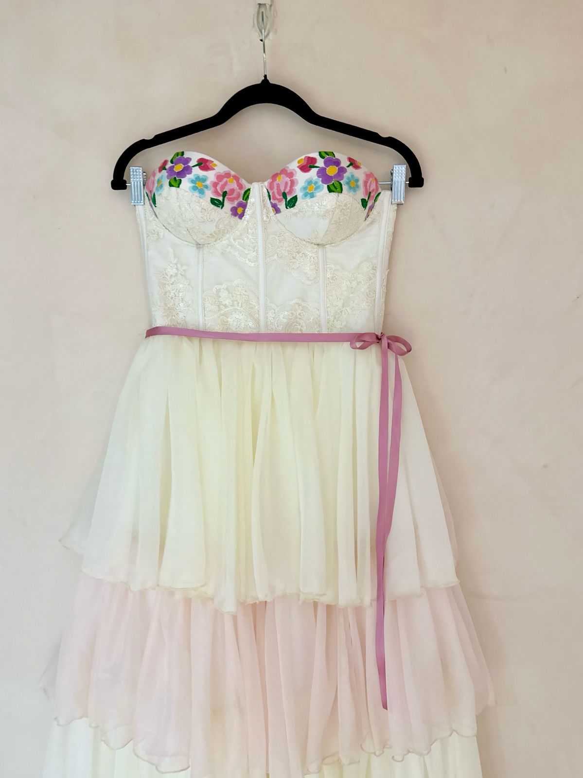 Vestido elaborado de tela de gasa en unos bellos tonos pastel, bordado a mano con técnica de agua por mujeres del istmo de Tehuantepec, Oaxaca, el corte de bustier tiene varillas y copas push-up.