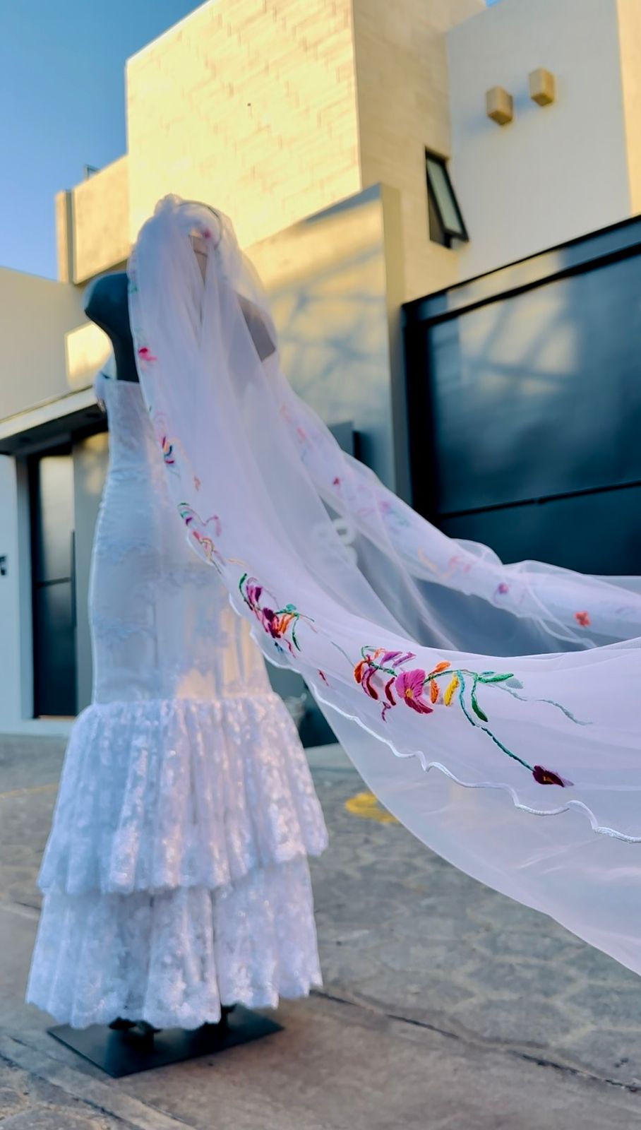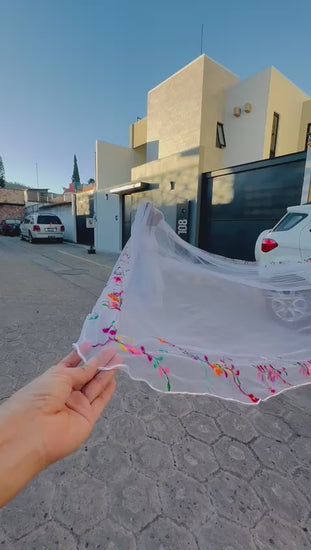 Este velo en tul está bordado a mano por mujeres artesanas con habilidades únicas, lo que lo hace ideal para novias que buscan un toque de color y tradición en su atuendo. Con 3 metros de largo, este velo es perfecto para ceremonias formales. ¡Haz tu pedido con anticipación y sorprende a todos con este hermoso velo bordado!