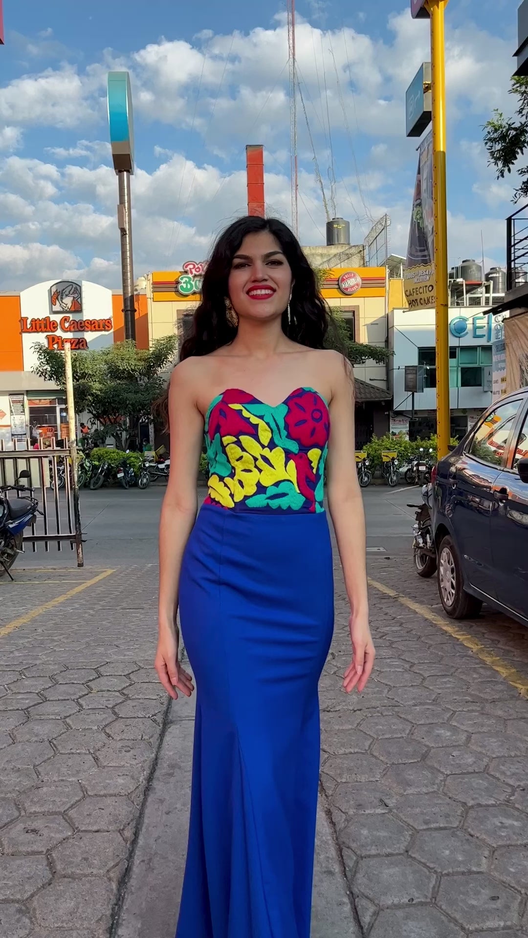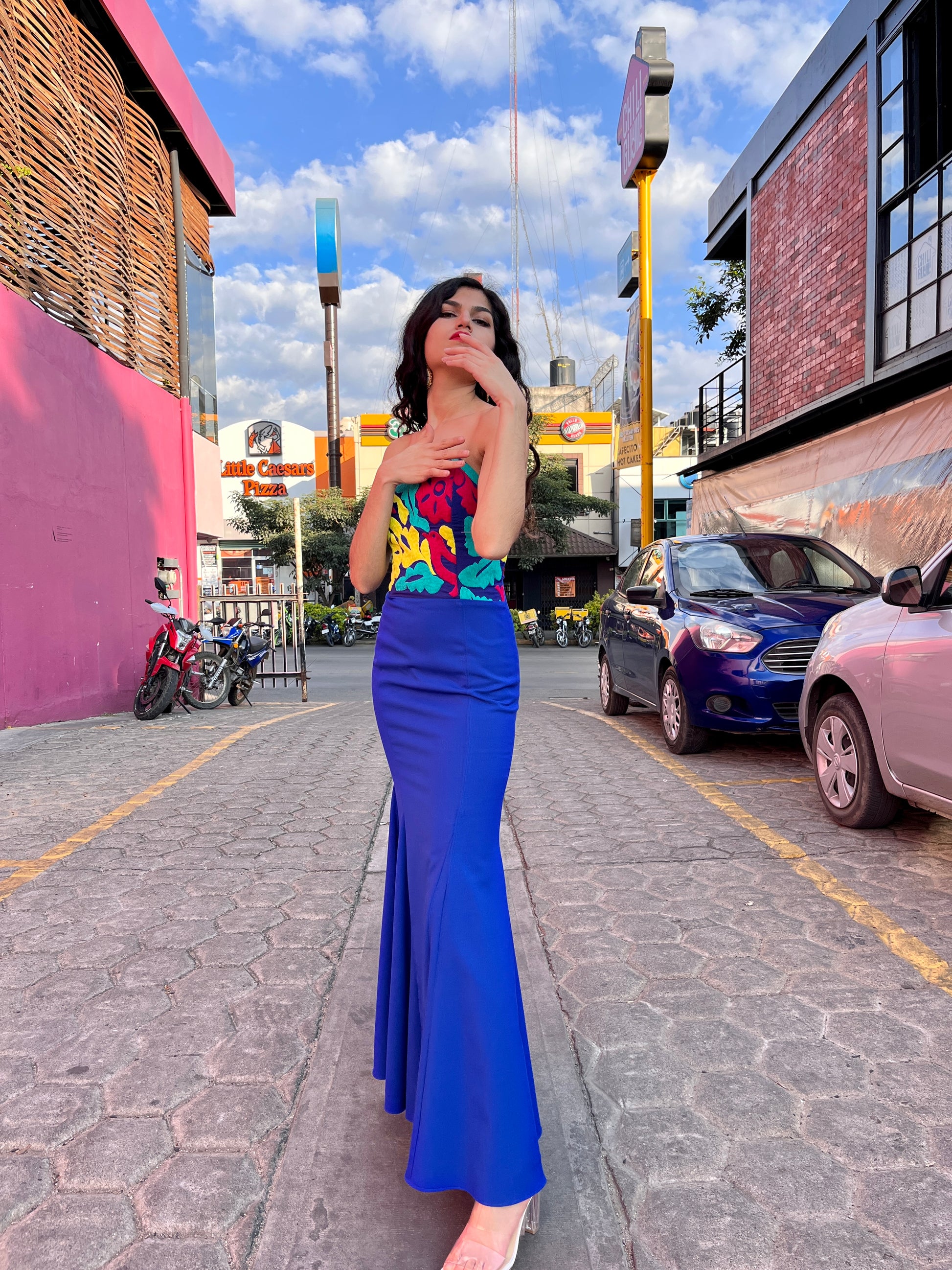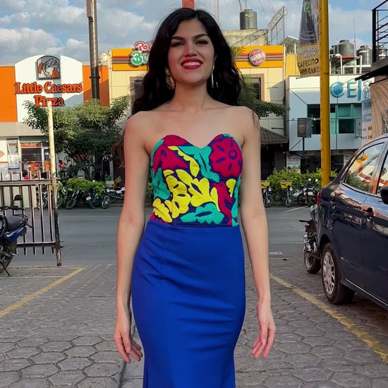Vestido azul de strapless con bordado de Jalapa de Díaz