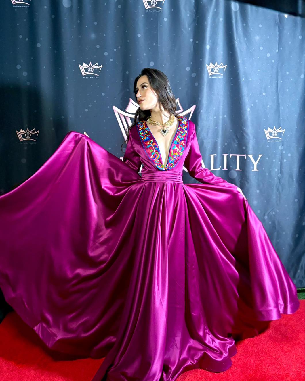 Este vestido de gala en un profundo tono bugambilia combina elegancia y tradición a través de su bordado artesanal realizado con hilos de seda originarios de San Antonino Ocotlán, Oaxaca. Su cierre en la espalda aporta un ajuste impecable, realzando la figura con sutileza. La pieza perfecta para destacar con sofisticación en eventos exclusivos.
