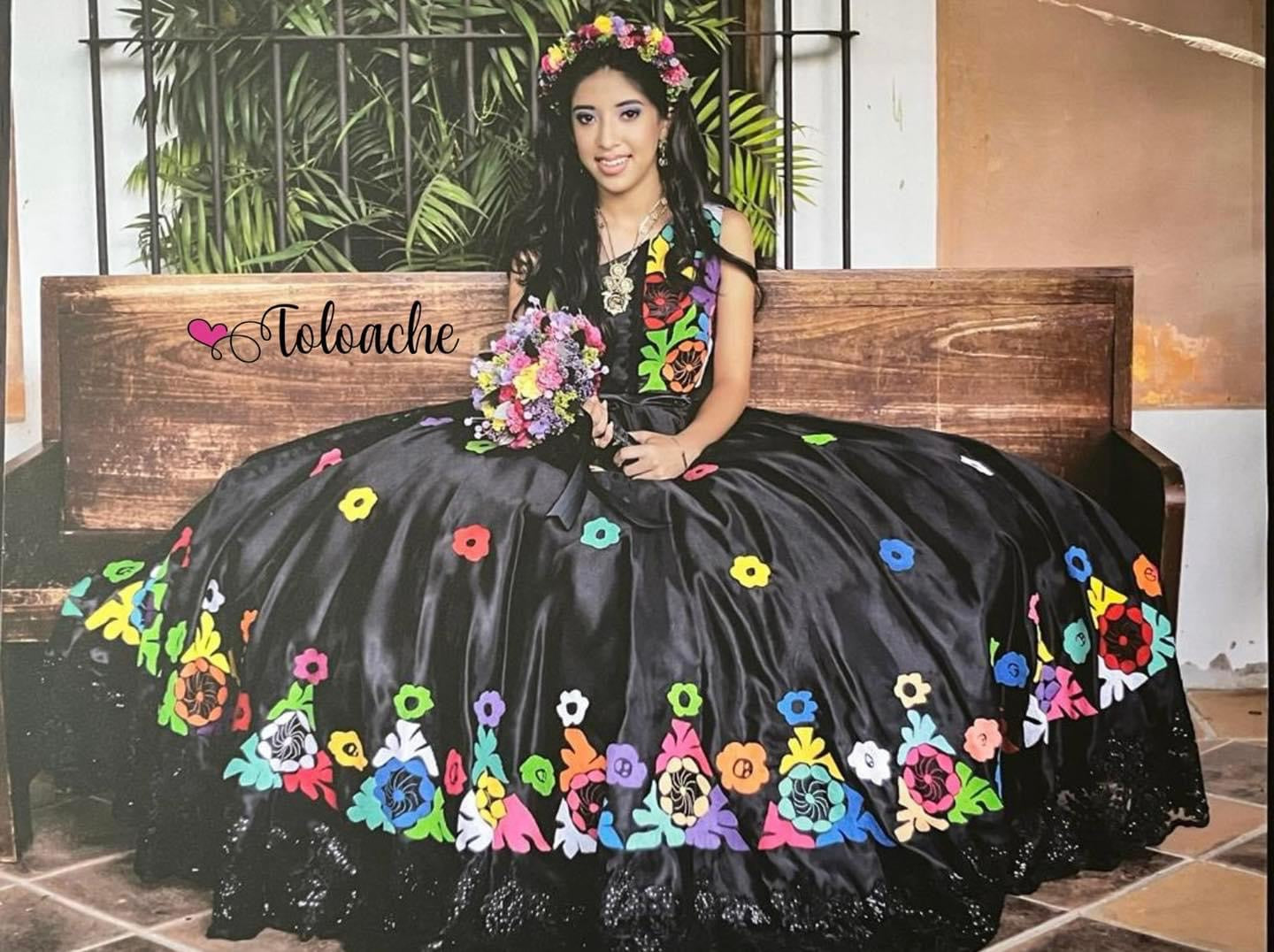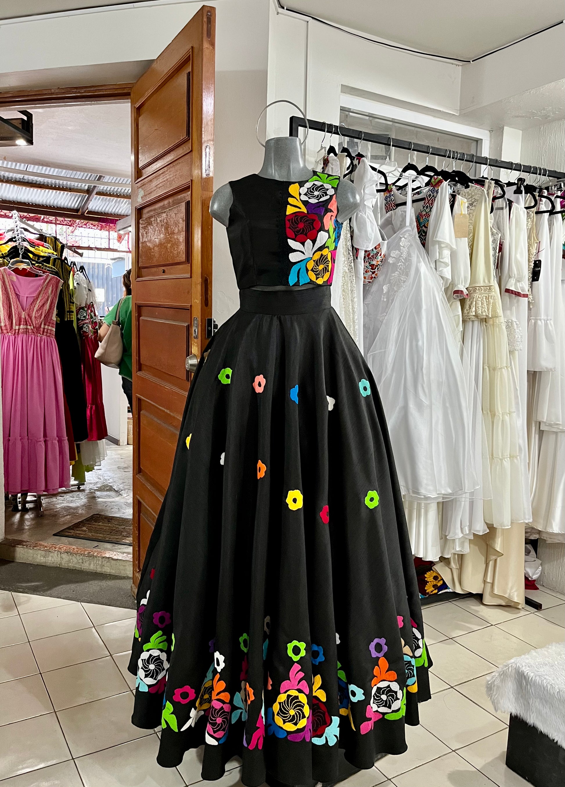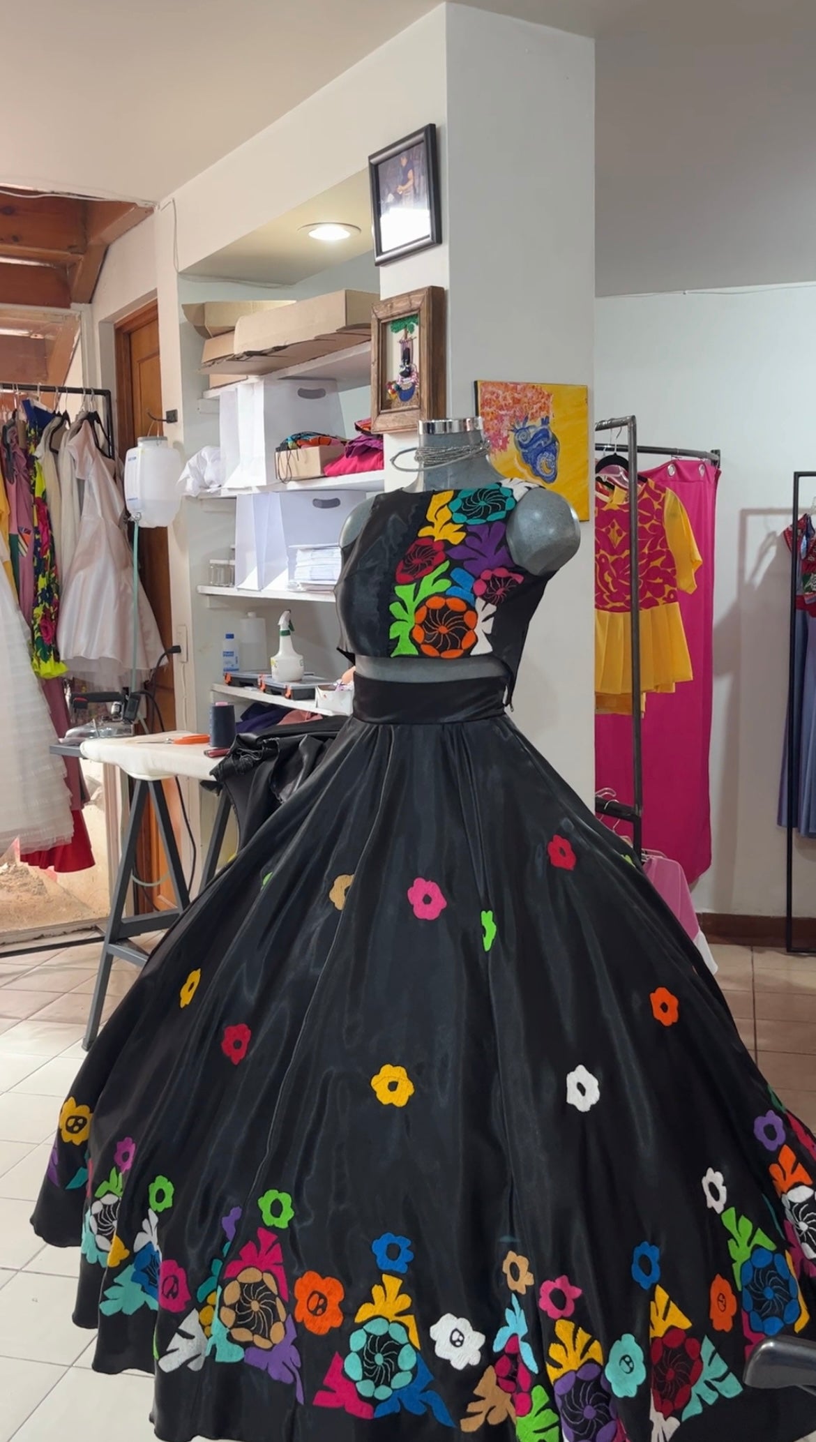 Vestido de Xhantu negro, con bordado a mano sobre la tela por mujeres artesanas de la cuenca Oaxaca