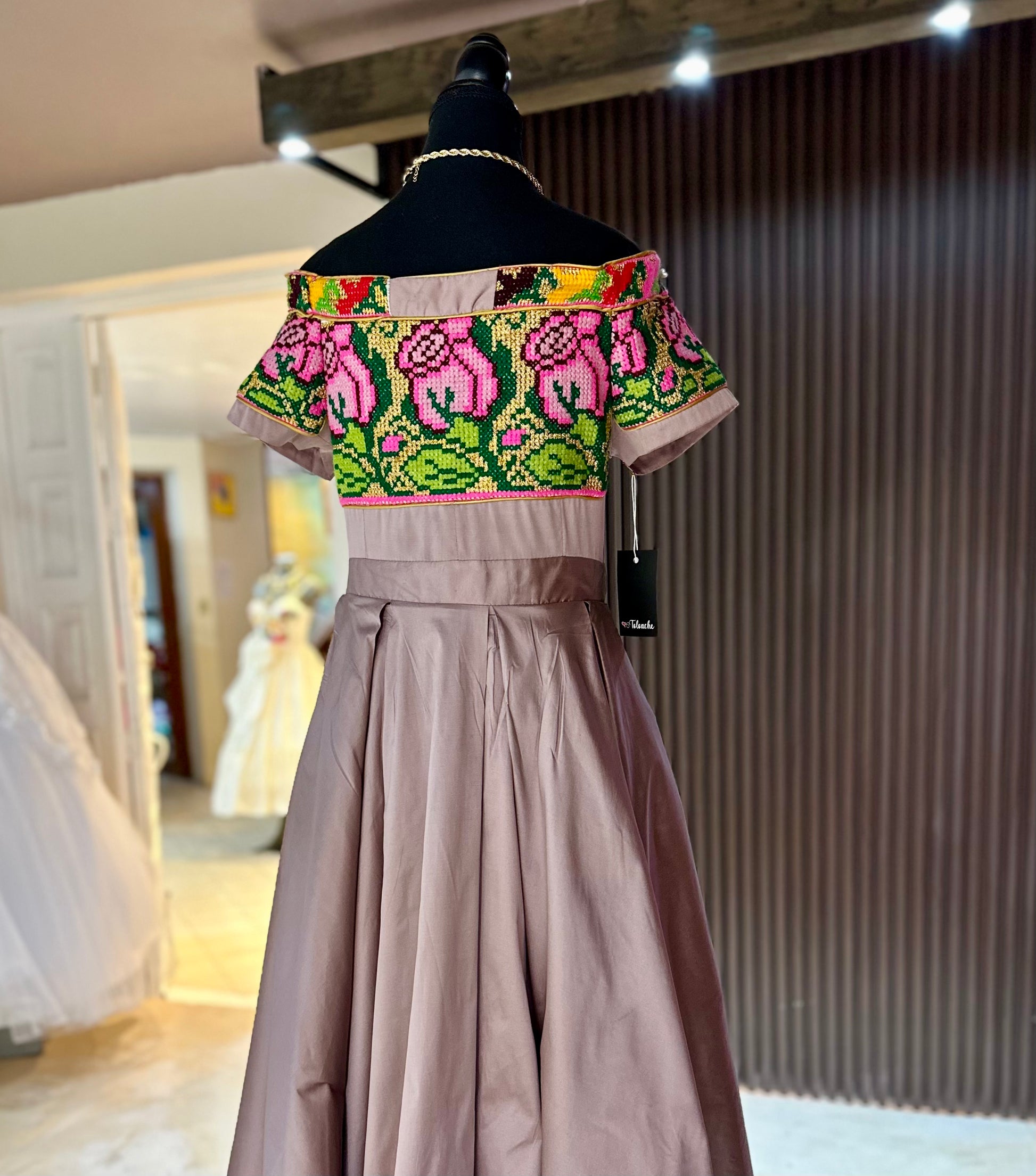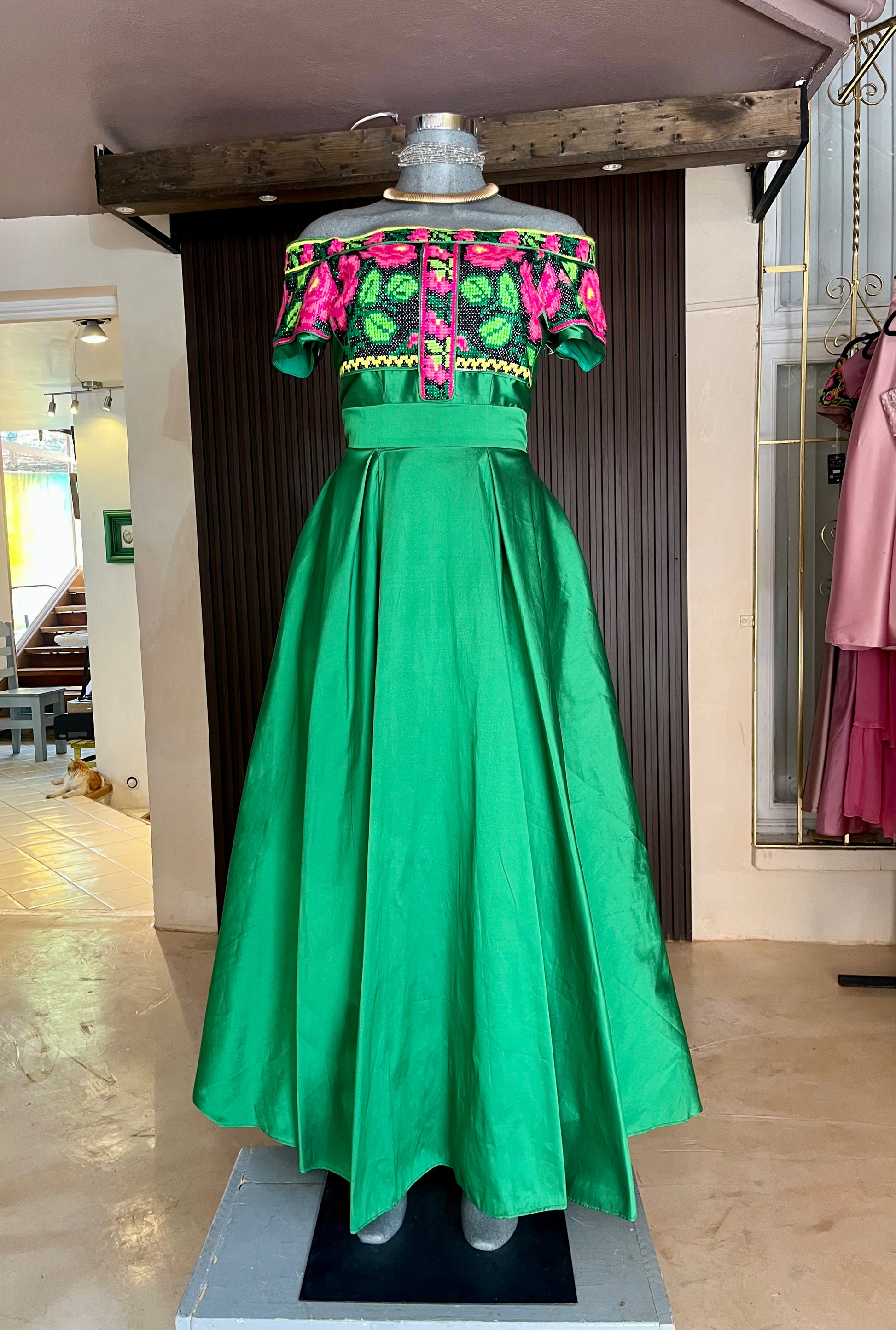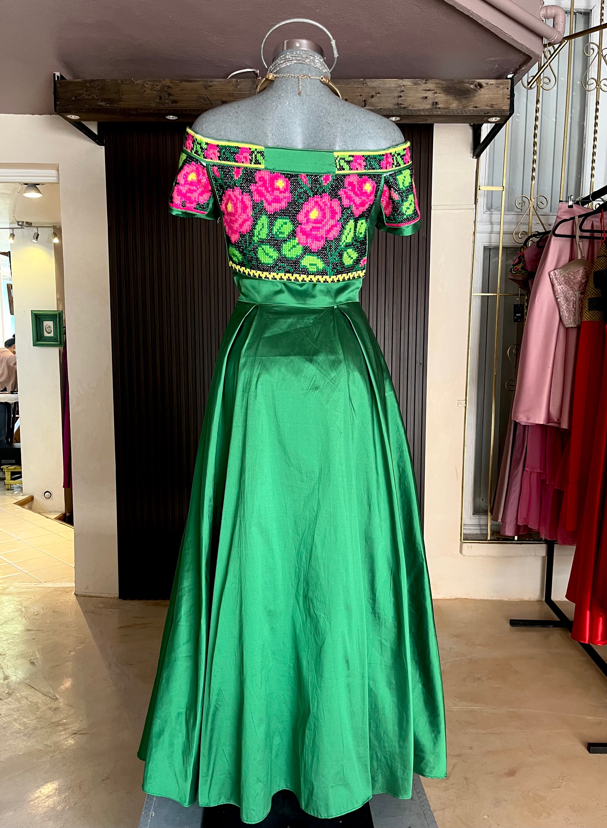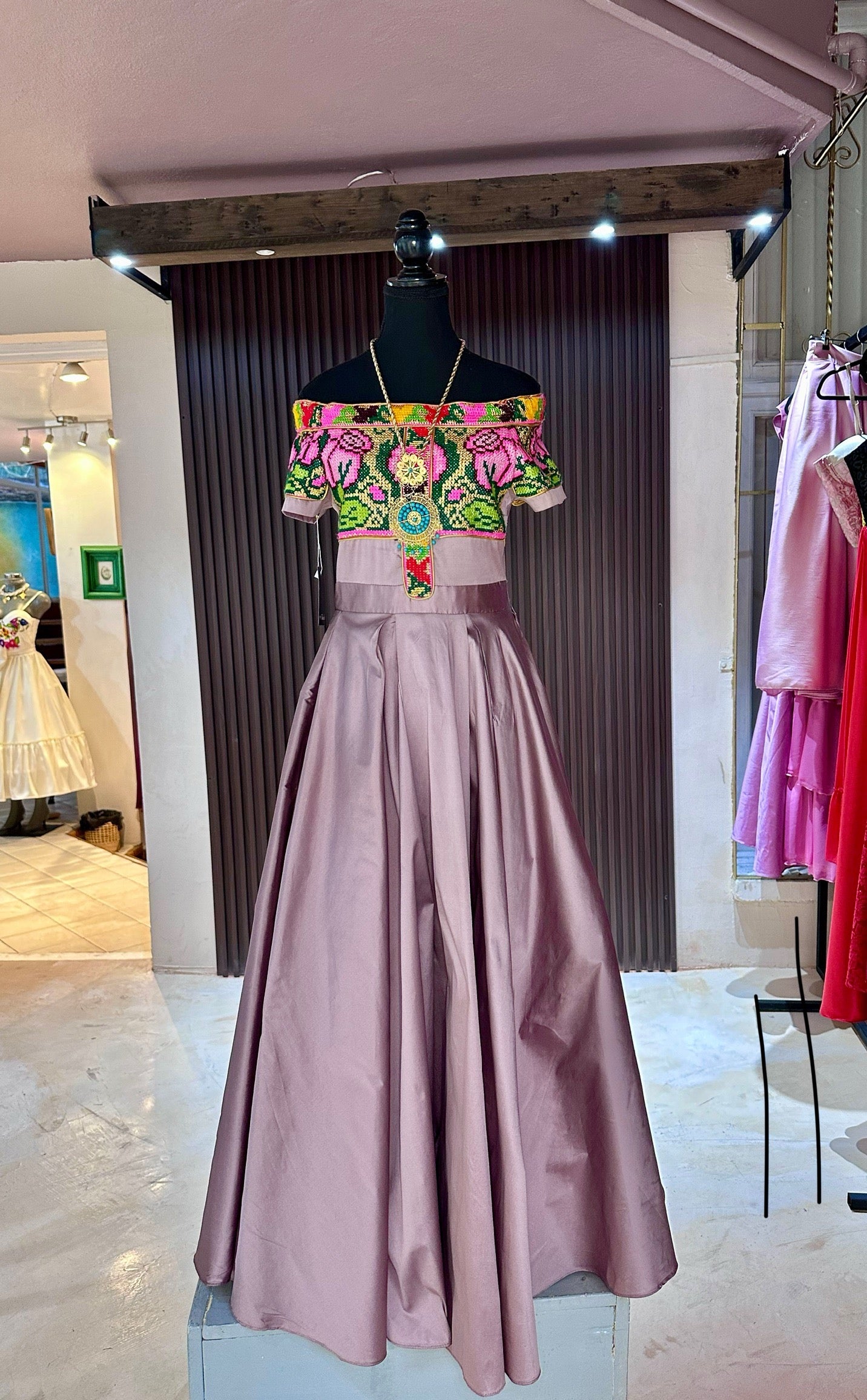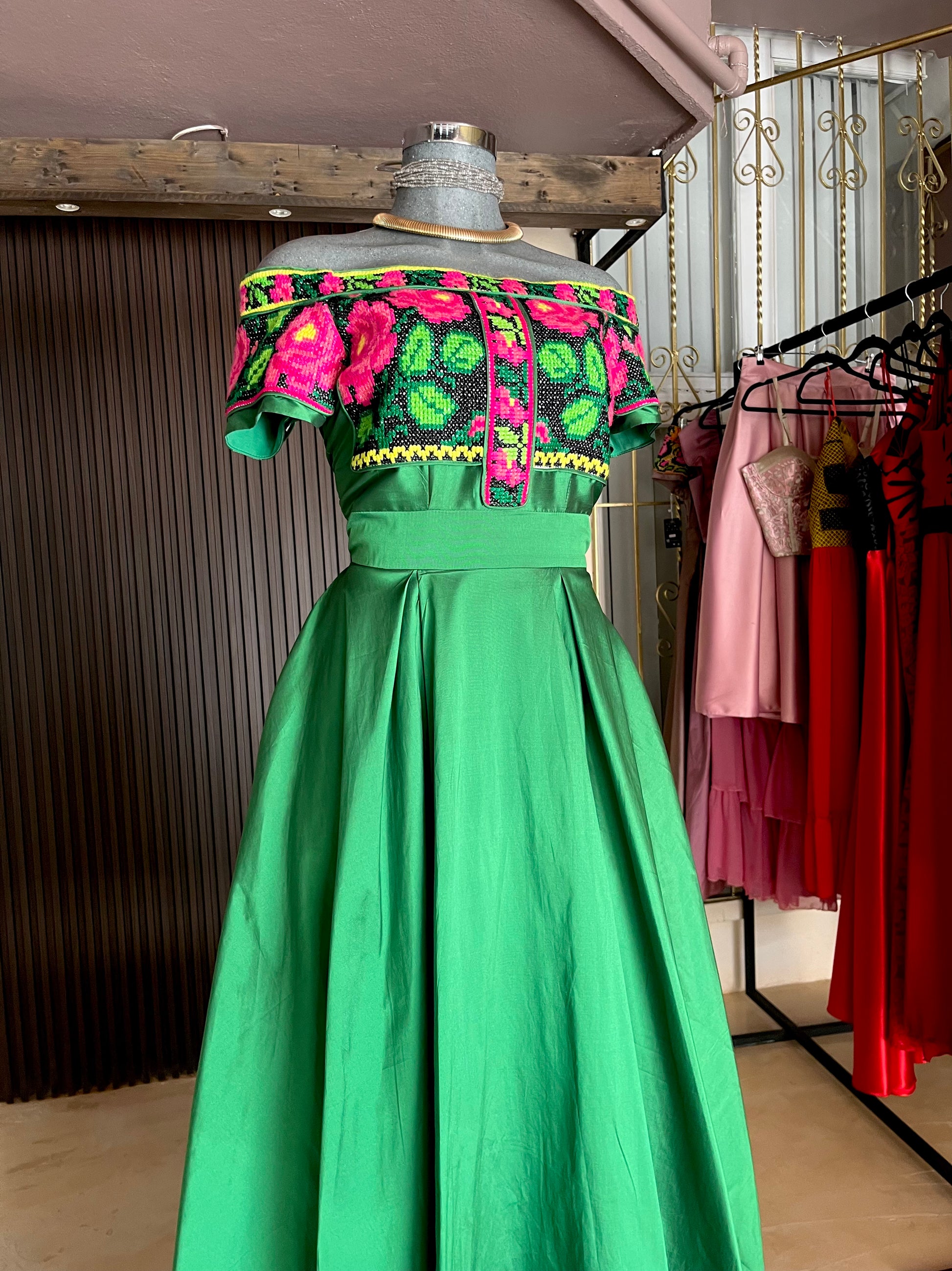 Vestido satinado en un corte circular con la falda tableada, el talle es un corte campesino con bordado de punto de cruz De Santiago Yaitepec, Oaxaca, cierre al costado.